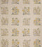 A patchwork style motif showing the playful faces of mythical creatures prancing between abundant fruit trees.