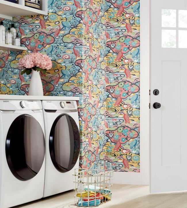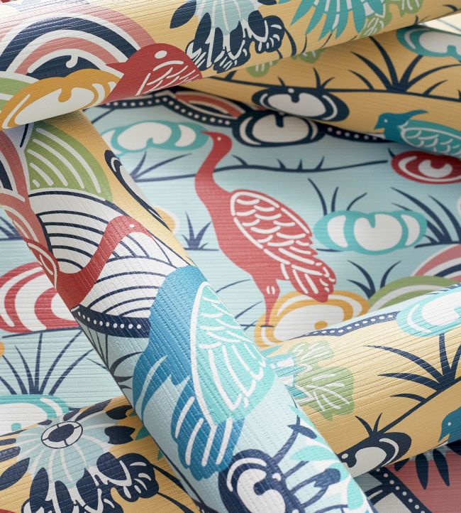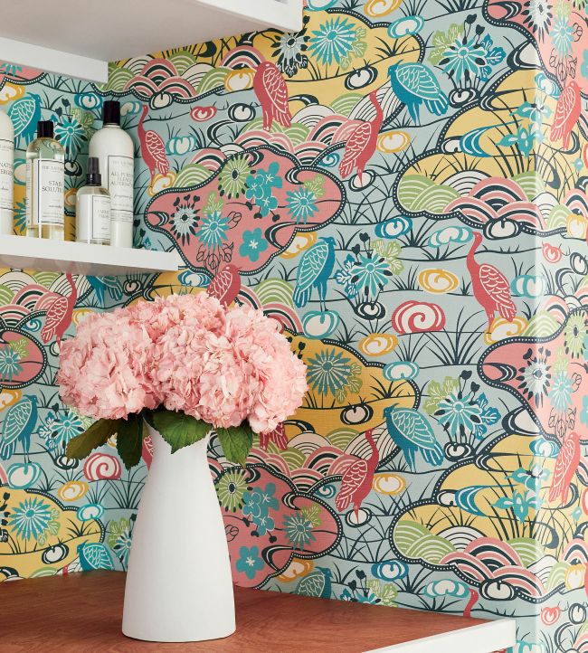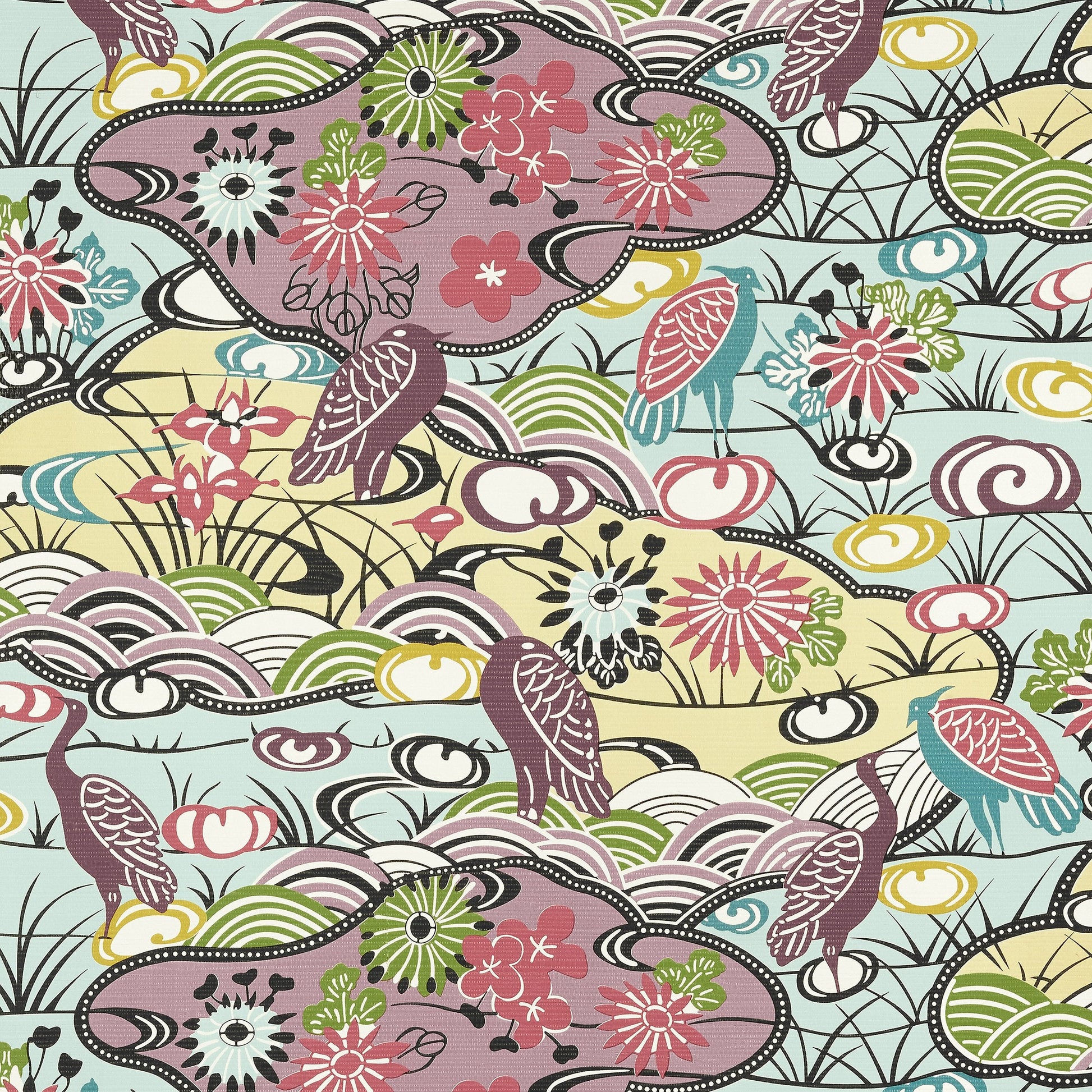 Introducing Heron Stream from Thibaut's Pavilion wallpaper collection. This exquisite wallpaper features herons and flowering aquatic plants intermingled with blossoms and chrysanthemums, set against winding streams and cloud-shaped cartouches. Adapted from an antique document on Okinawan design, Heron Stream wallpaper preserves the rich, original colourways, offering a deep and visually captivating experience for your walls.