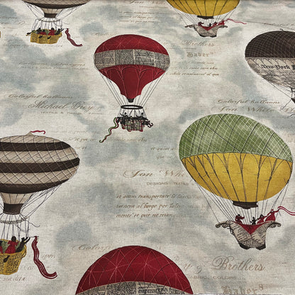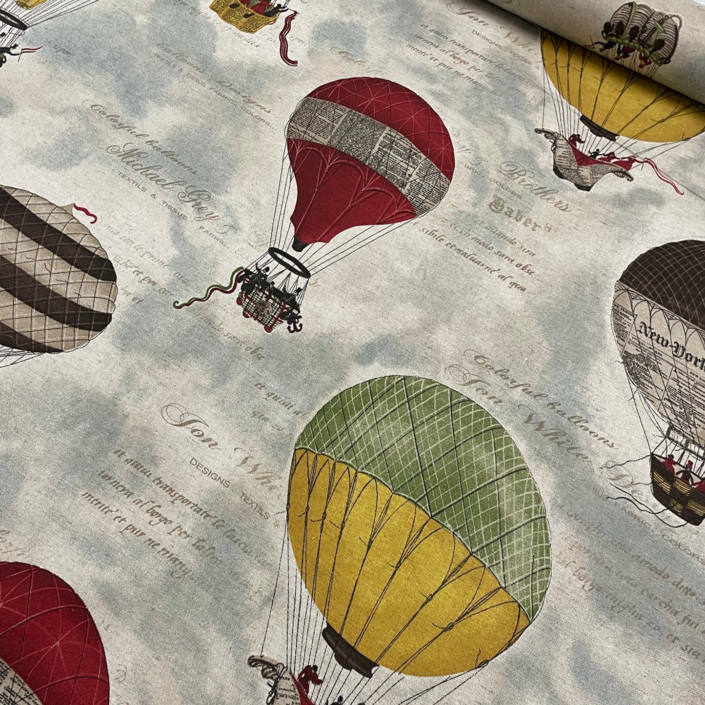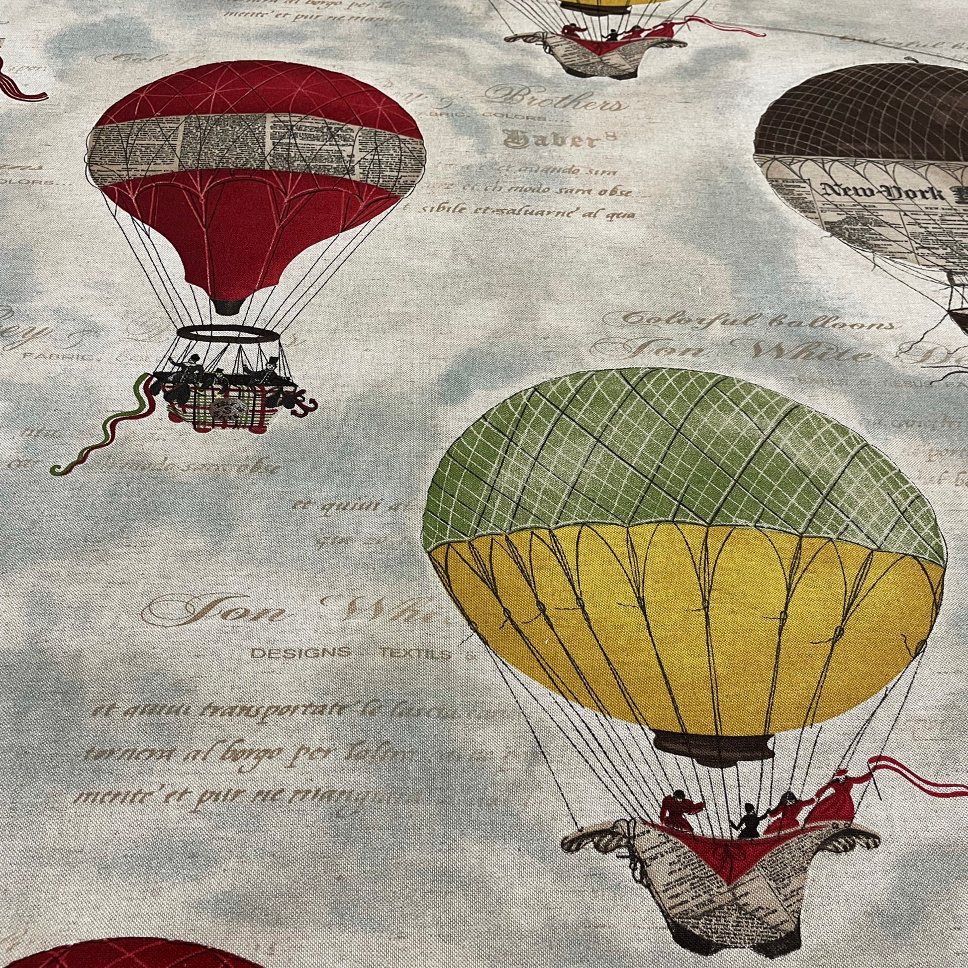 Digitally printed on to a high quality cotton blend fabric, the sky is filled with vintage style hot air balloons, flying up, up and away!