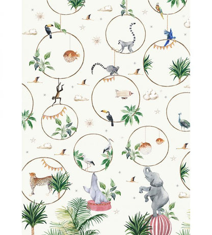 Seals, elephants, leopards, zebras, giraffes and more, are seen performing on this imaginative mural. Printed on non-woven paper. Divided into 4 x 48.7cm drops.