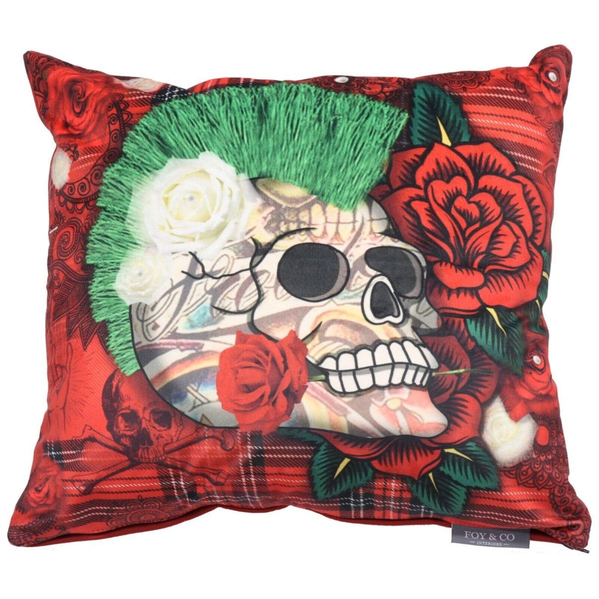The vibrant Johnny Punk Cushion is a soft, colourful cushion that will add a bold splash of colour to your furniture. The digital print features a large spiked skull surrounded by multicoloured roses. The reverse is a plain red background. Made from soft super soft velvet, this cushion would make a perfect Halloween decoration or a gift for someone who loves punk.