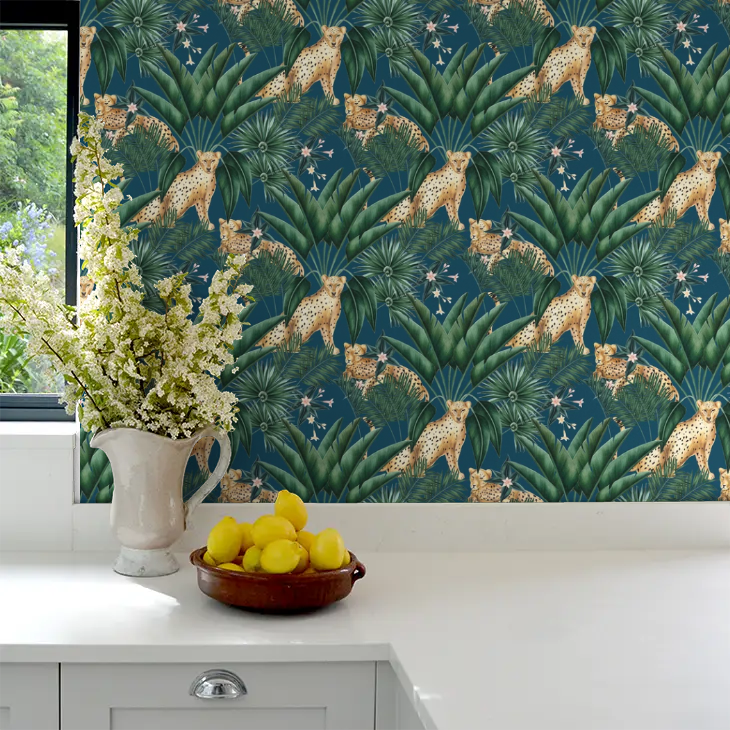 Lush jungle foliage provides shelter for this gorgeous cheetah to meander amongst the dense tropical leaves and flowers. Bold and exotic, this design reflects the strength and cunning of the fastest land animal.