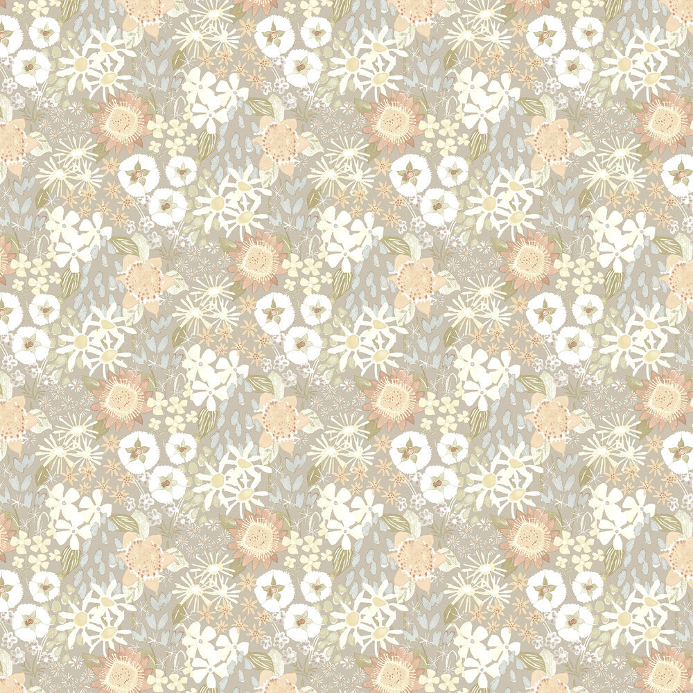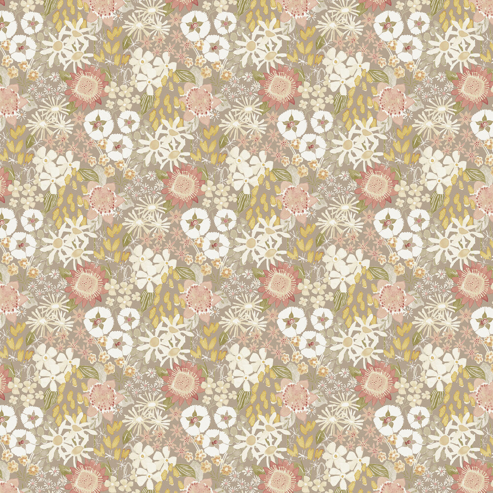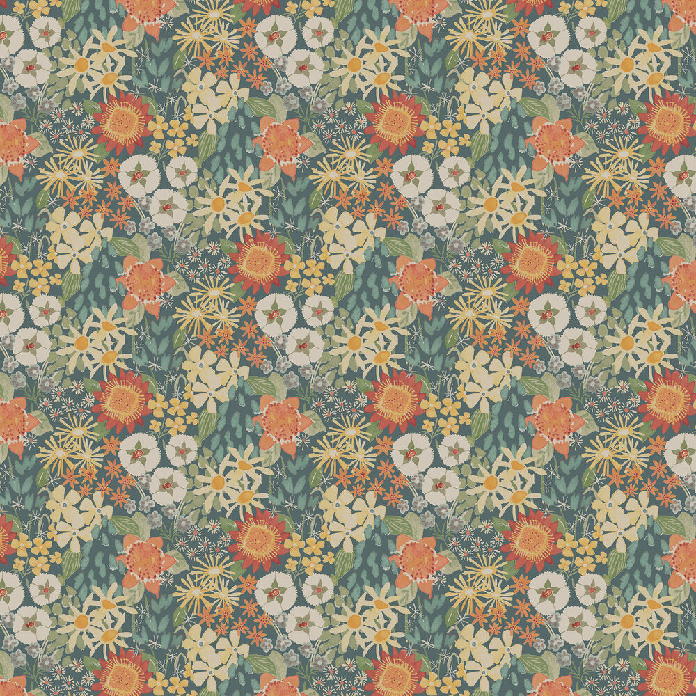 Fabulous blooms with a nostalgic colour palette for a contemporary take on retro design. An array of wild flowers are drawn in a playful style, creating a cheerful look for any interior scheme.