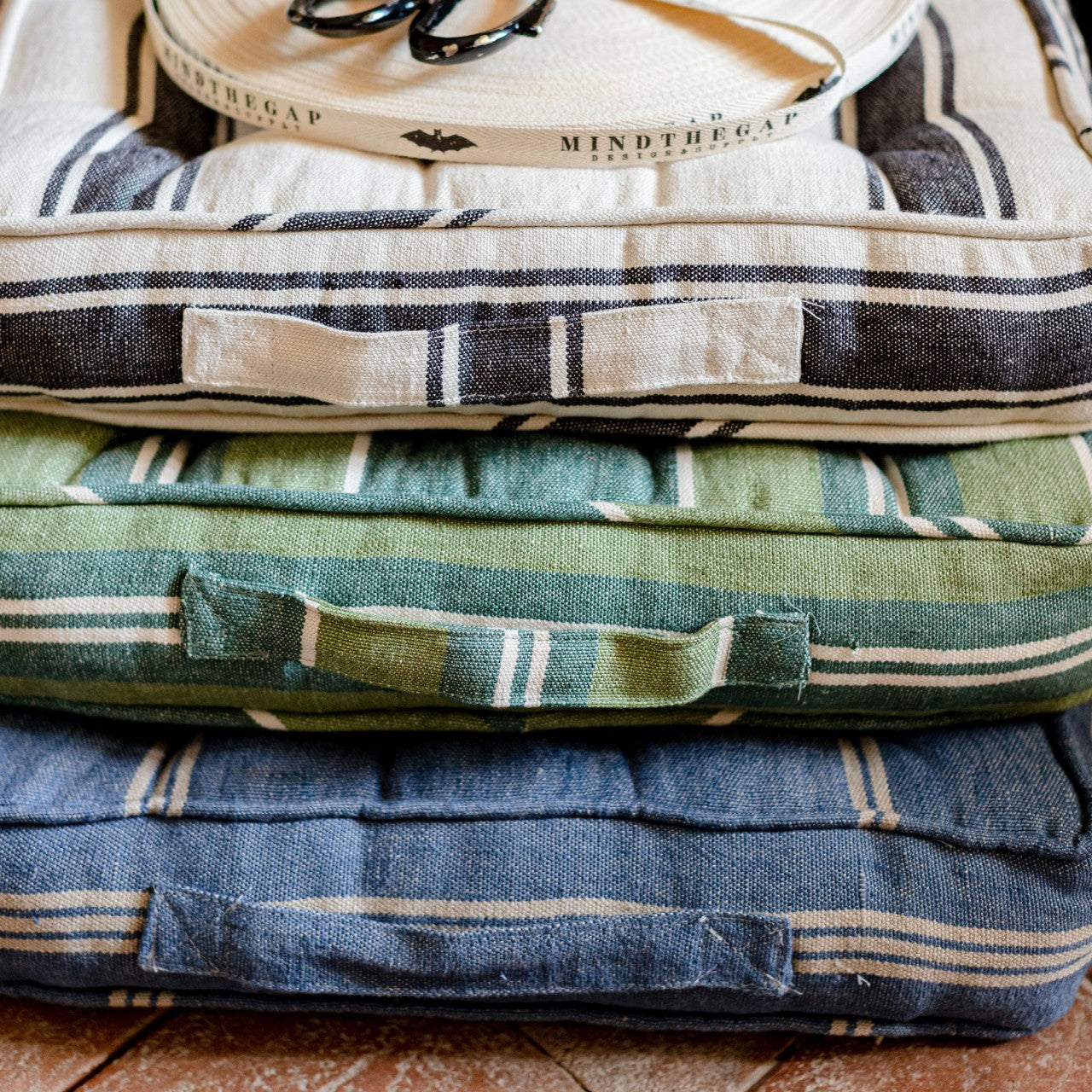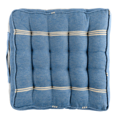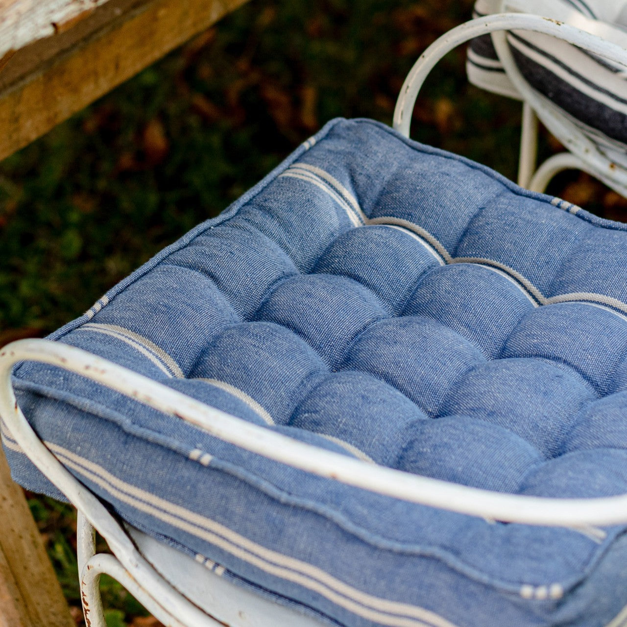 Revamp your dining chairs with our stylish and comfortable new padded cushions. Made of blue and beige woven natural linen, the KATALIN STRIPE linen chair cushion is hand sewn and finished with a piped edge that matches the fabric. Filled with thick poly foam insert with polyester cove, each cushion is decorated with a beautiful linen handle. Replicating the authentic fabrics of our ancestors, this padded cushion is available in four other premium quality woven linens: SZEPVIZ, HERINA, RHUBARB and HAJDU STRIPE. Composition: 100% Linen, Finishing: Assorted piping