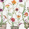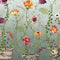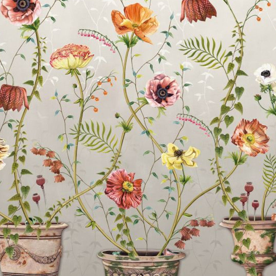 Exaggerated blooms of fritillaria, poppies and anemones, and creeping vines grow from terracotta urns, set against a lime-washed wall, with a tiled stone floor scattered with colourful shells.