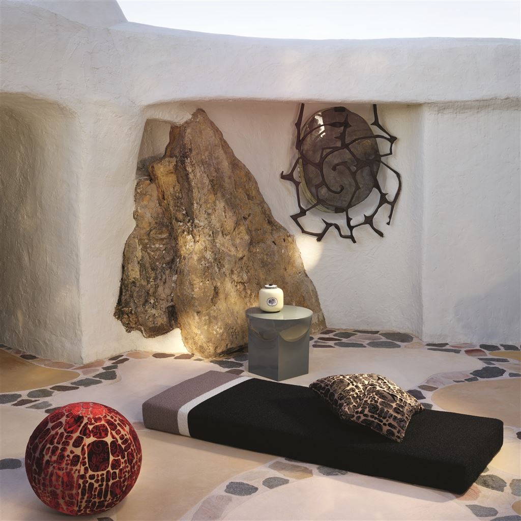 An expressive cut velvet from Maison Christian Lacroix in abstract shapes with an intertwined damask pattern. Stylish and versatile, the two-tone velvet pile is in contrast to the neutral linen weave ground. A perfect fabric for inspired curtains, blinds, bedcovers and upholstery. In five distinct colourways. Composition: 56% Viscose 24% Linen , 20% Polyester.