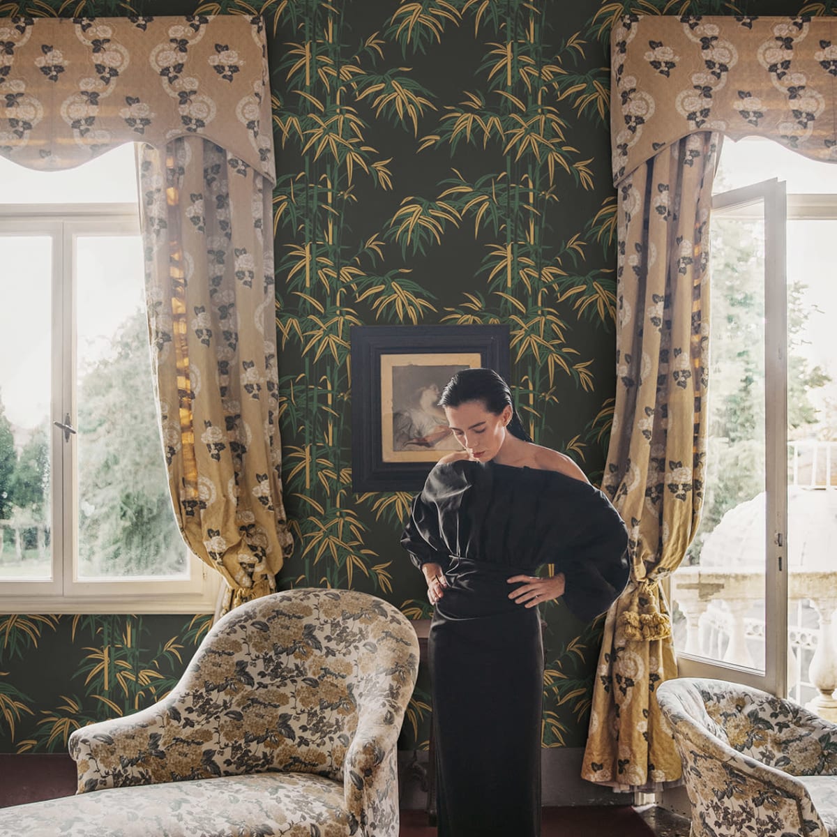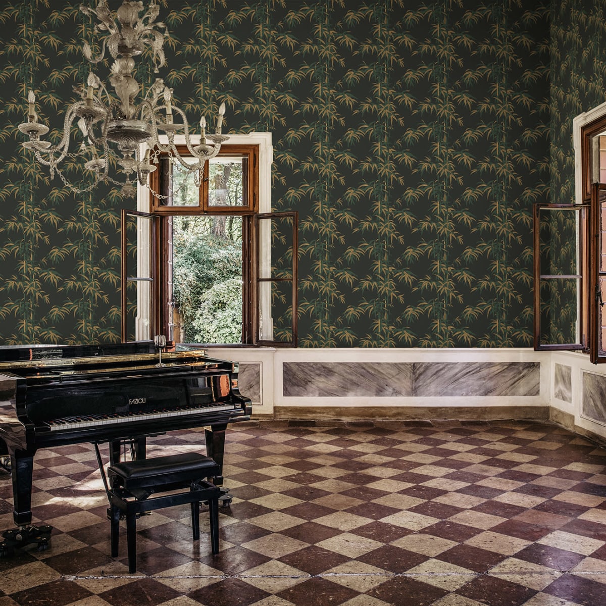 A beautifully stylized motif with plumed bamboo branches forms a serene greenery in the room.