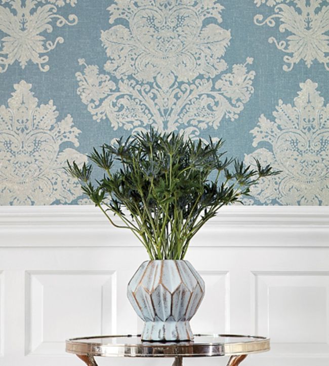 Taken from a fabric document, the raised motif in Licata Damask is achieved through a puffed ink in the print technique. This pattern is offered in mid-tone to dark colorways with a linen background.