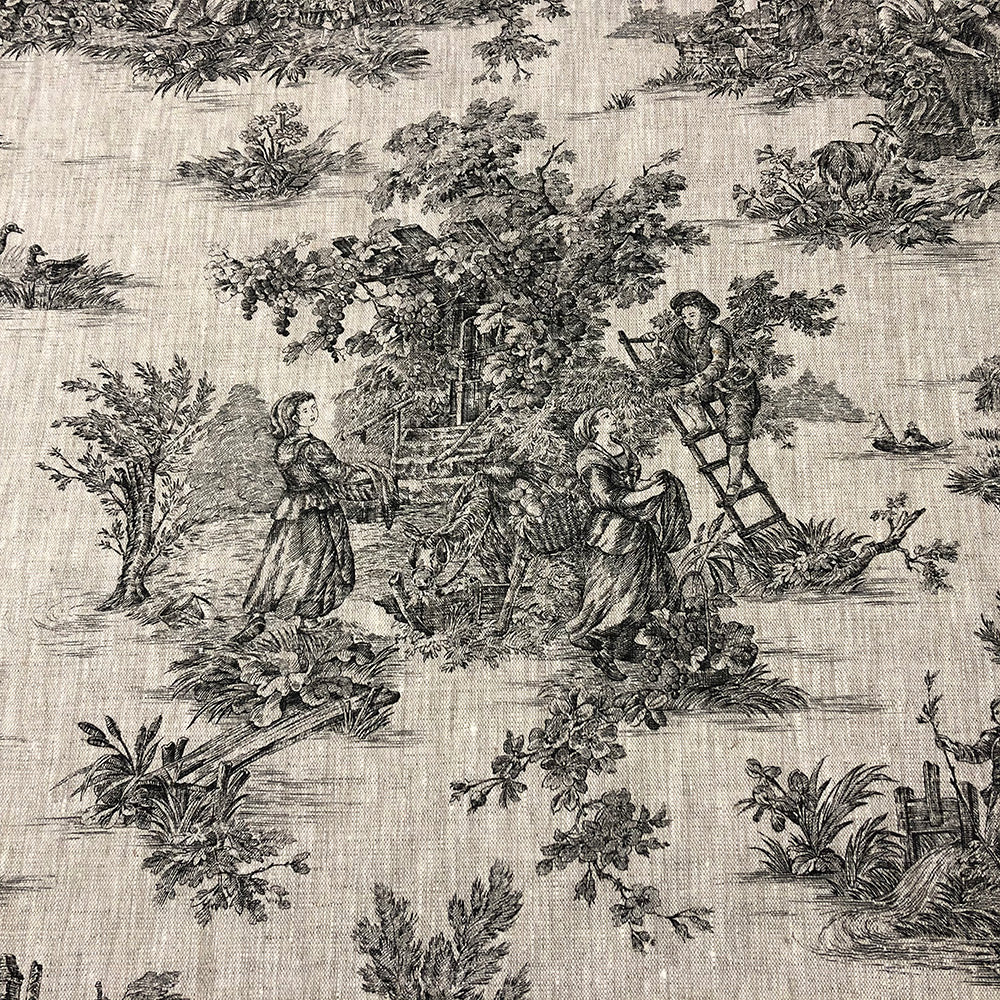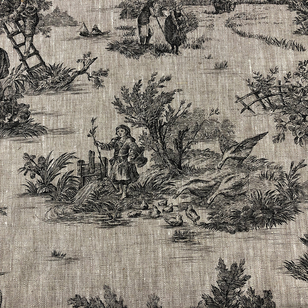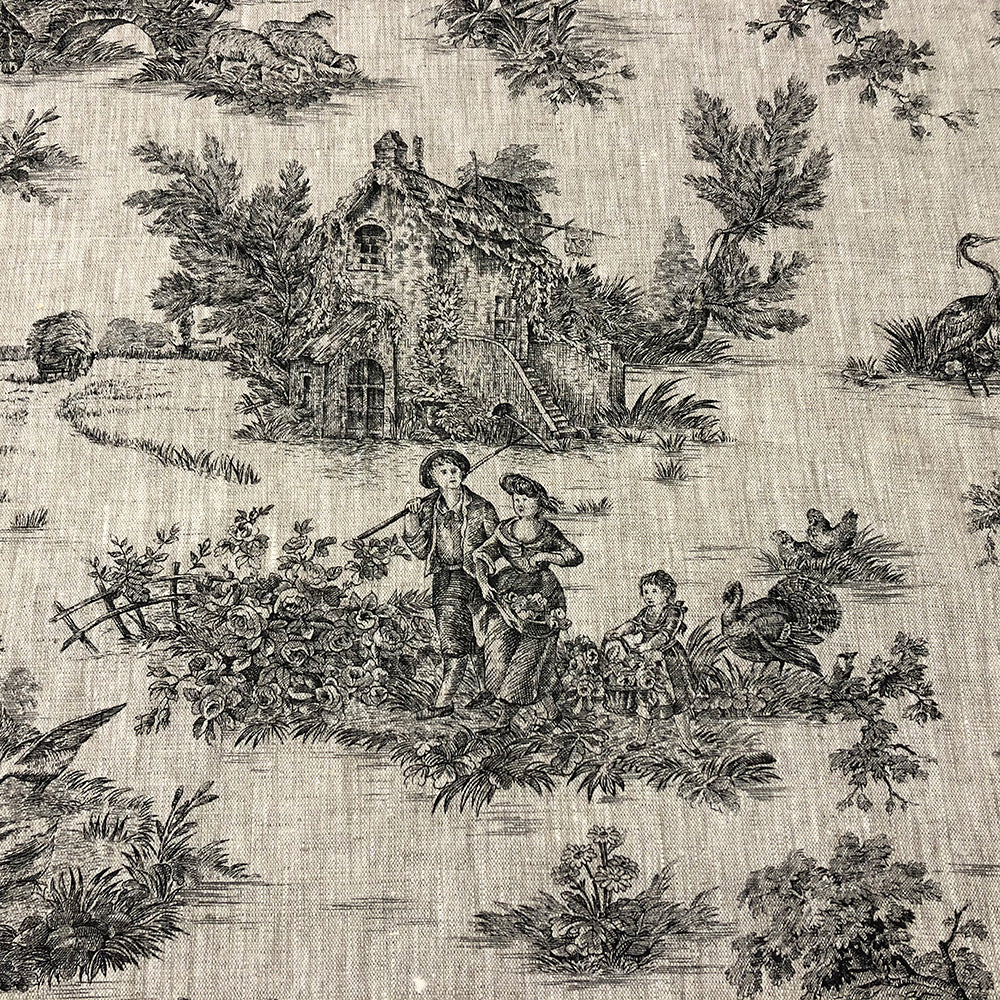 A stunning linen fabric woven with the traditional French toile scene. Printed on a luxurious 100% linen cloth, this fabric is perfect for curtains and upholstery.