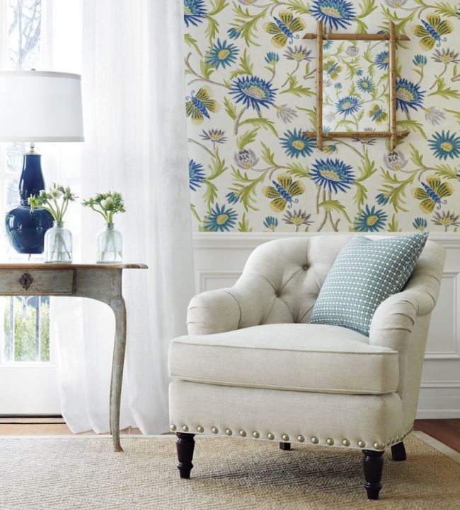 Lizette's naive design is full of simplistic blooming flowers and playful butterflies with gentle pencil-like outlines. The pattern was inspired by an antique rug. Lizette is available as a wallpaper.