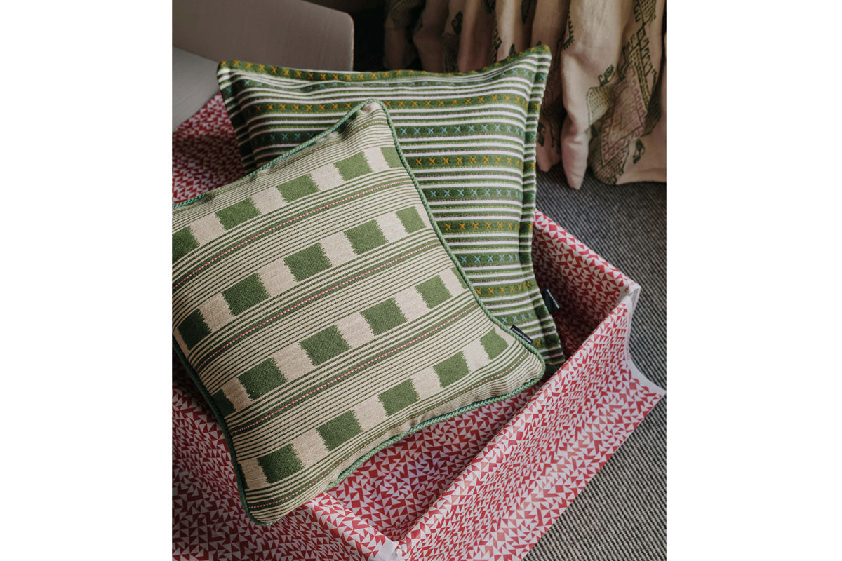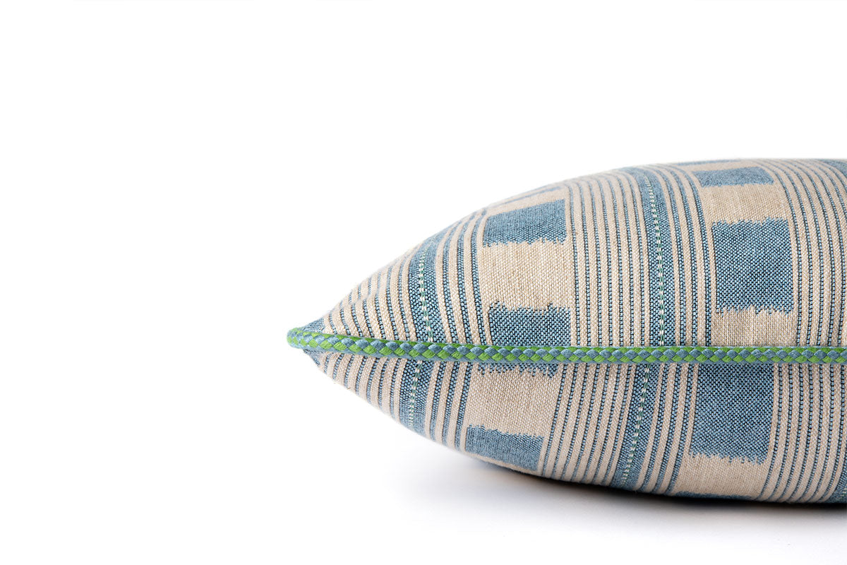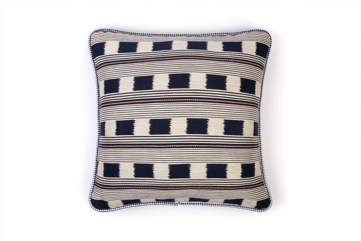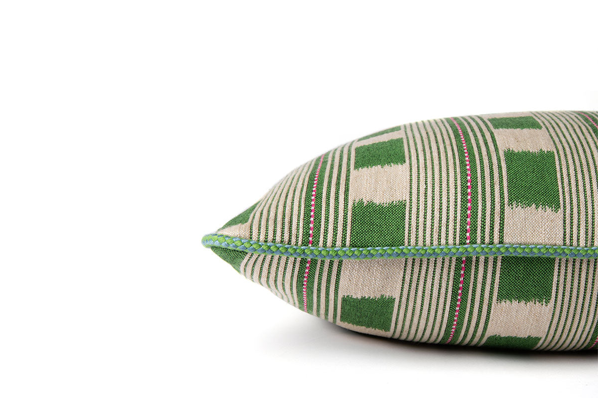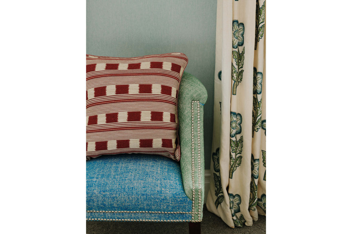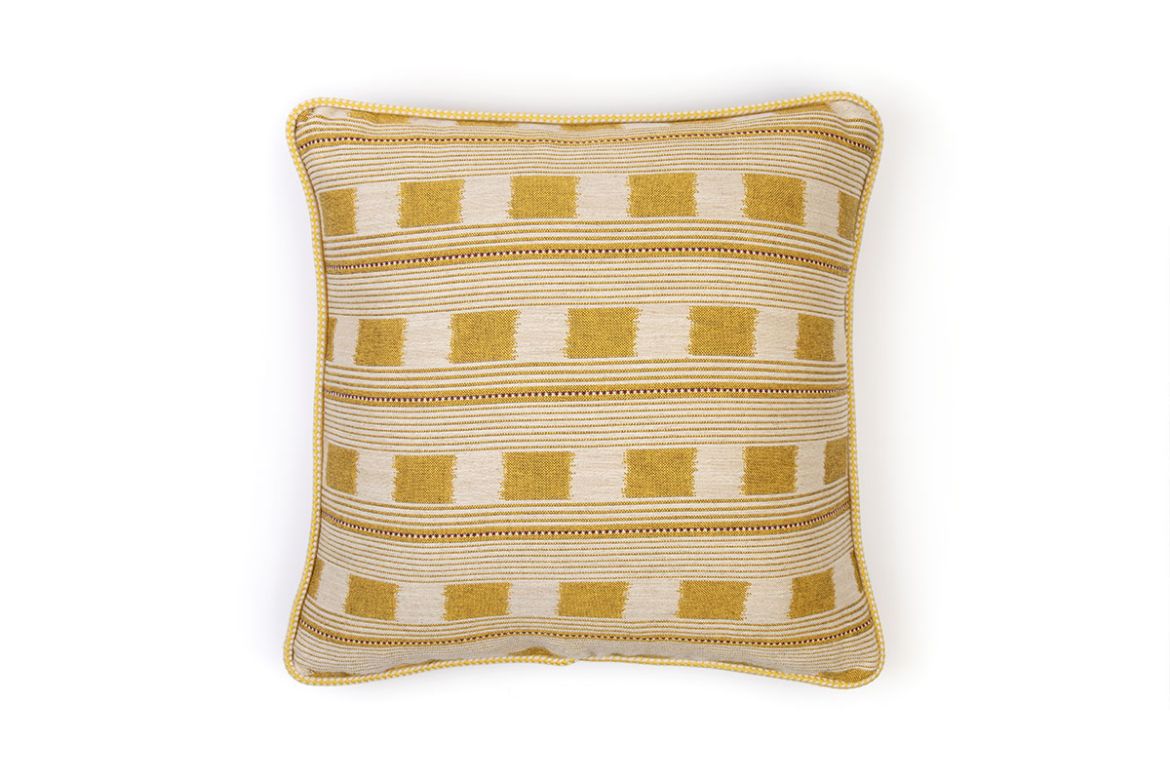Kit Kemp's ever-popular woven design; a re-working of a classic cotton ticking textile with a dotted stripe alongside repeated squares. Available in Green, Dark Indigo, Lemon, Ruby, Denim and Natural. Material: 43% CO 34% VI 14% LI 7% PAN 2% PES