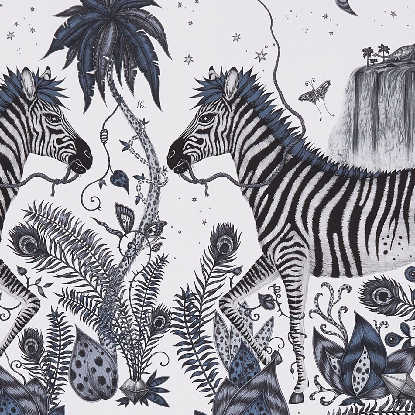 The Lost World Wallpaper made in collaboration with Emma J Shipley features an enchanting scene of discovery, with elements inspired by Jules Verne adventure novels and 1925 silent film The Lost World. With a curious peacock-tailed zebra, winding foliage, towering mountains and mighty dinosaurs in the distance, there`s a whole world to explore within this intricate design. The monochromatic blue-grey tones, and neutral off-white background will inject jungle magic into your interior.