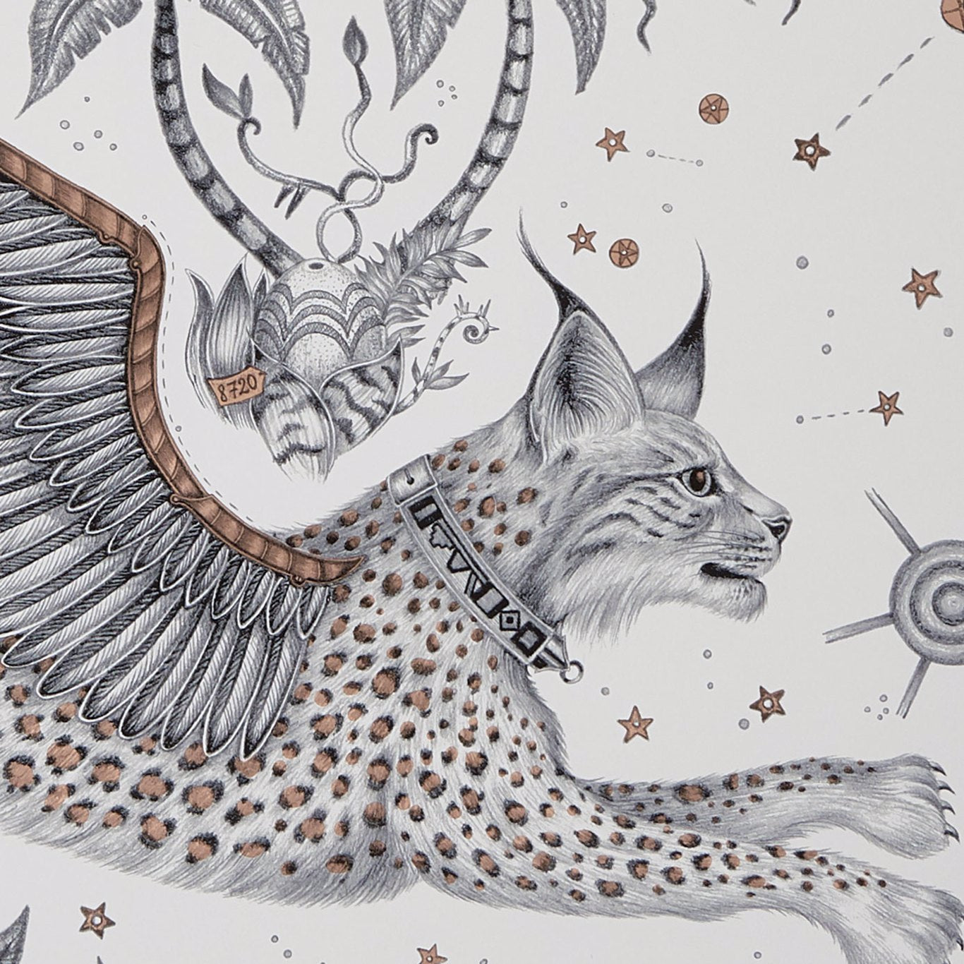 The Lynx Wallpaper, from our collaboration with Emma J Shipley, is a magical design inspired by South African rock paintings and mythology. The design features a winged lynx with magical peacocks tails, leaping through a starry night sky, surrounded by surreal foliage and palms that add a signature twist to this imaginative design. In this striking coral pink, magenta and teal green colourway, it`s a truly show-stopping design. This wallpaper is guaranteed to add wonder to your home with the magic of nature.