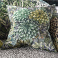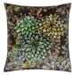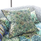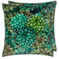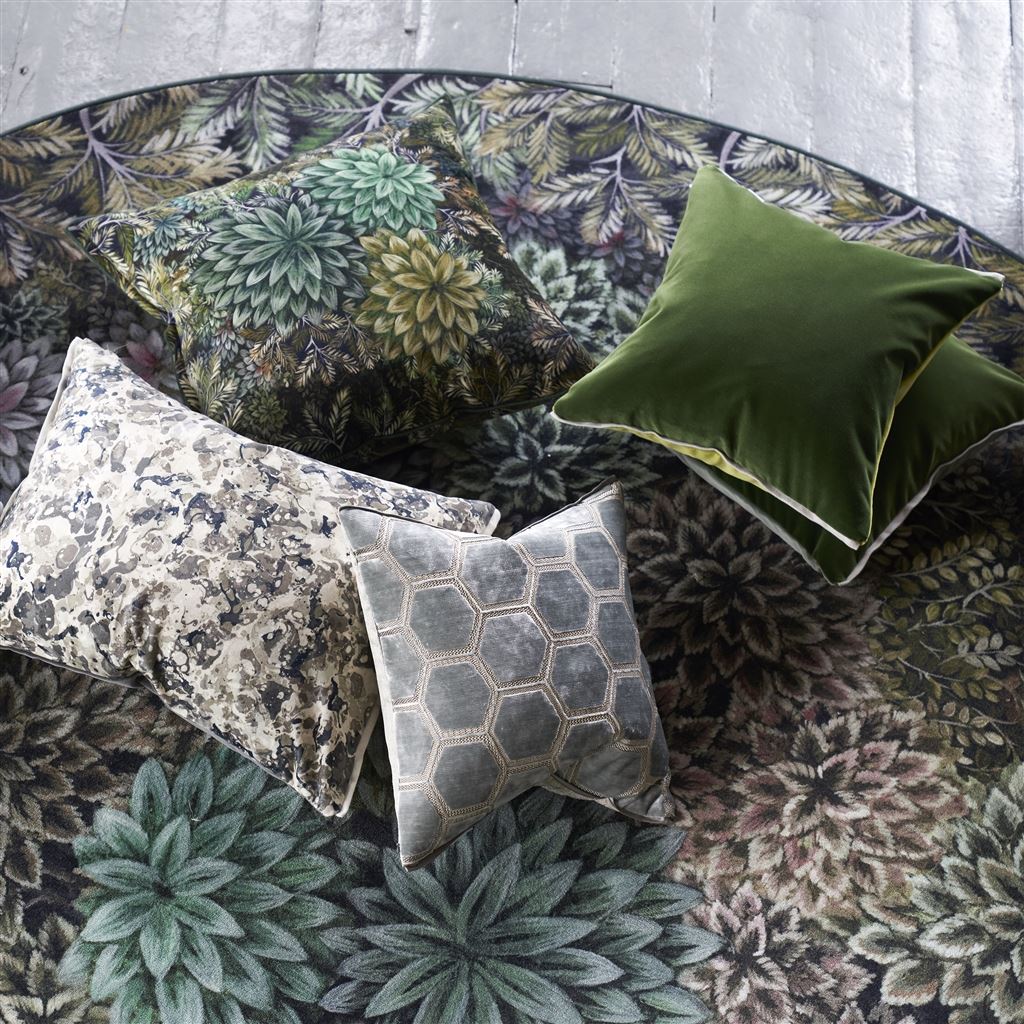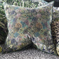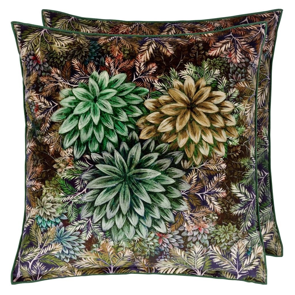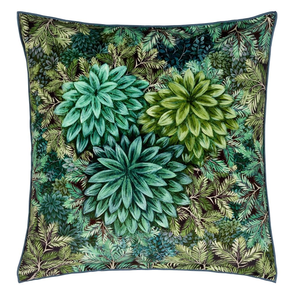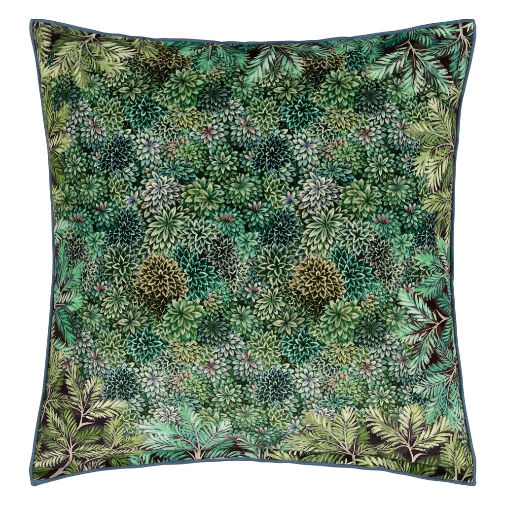 Inspired by the rich verdant forests in India's tea regions this stunning velvet cushion features layers of painterly leaves in soft tones of rich tones of chocolate moss and emerald in varying scales on the front and reverse. This decorative large square cushion is digitally printed onto luxurious velvet and finished with an overlocked edge.