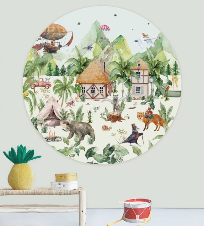 This fantasia circle wall mural design shows something different every time you look at it. With bears, birds, racoons and rabbits all acting in a peculiar way!