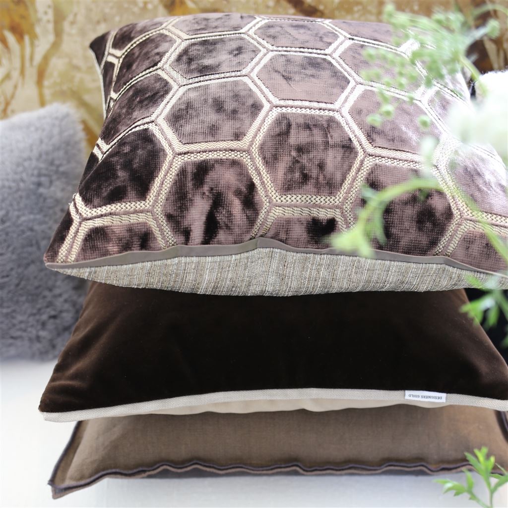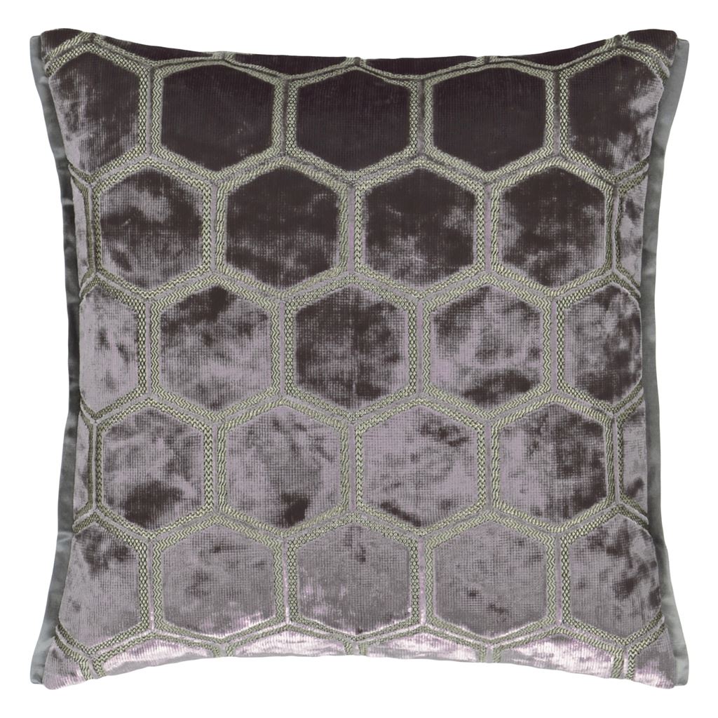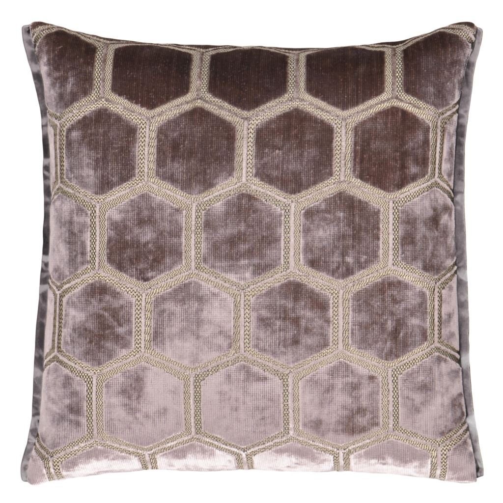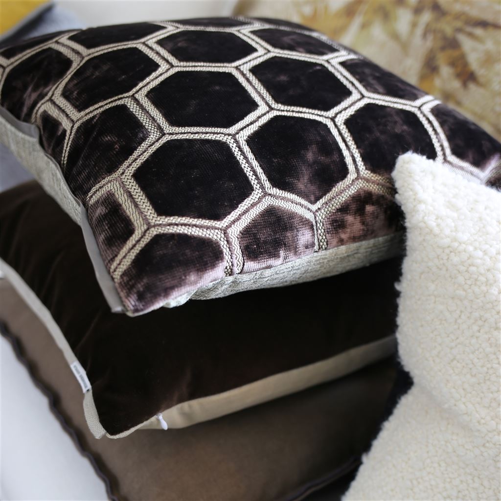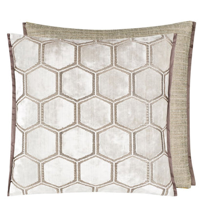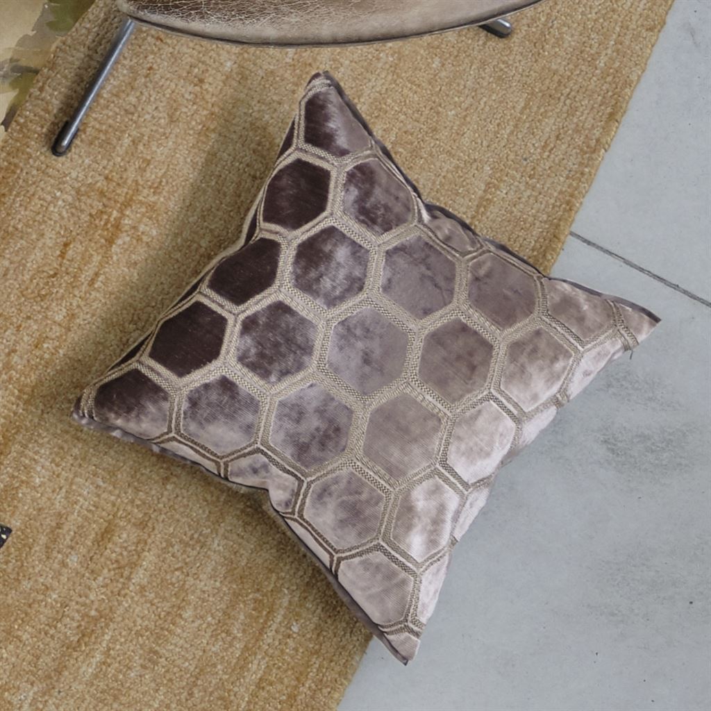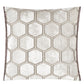 This stylish cut velvet square cushion in oyster white features a bold scale hexagonal geometric with a unique patterned effect in the ground. Elegant and sophisticated, this luxurious cushion is finished with a Kumana reverse in cool marble and a zinc trim. All our cushions come with a luxurious feather pad.