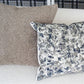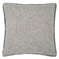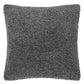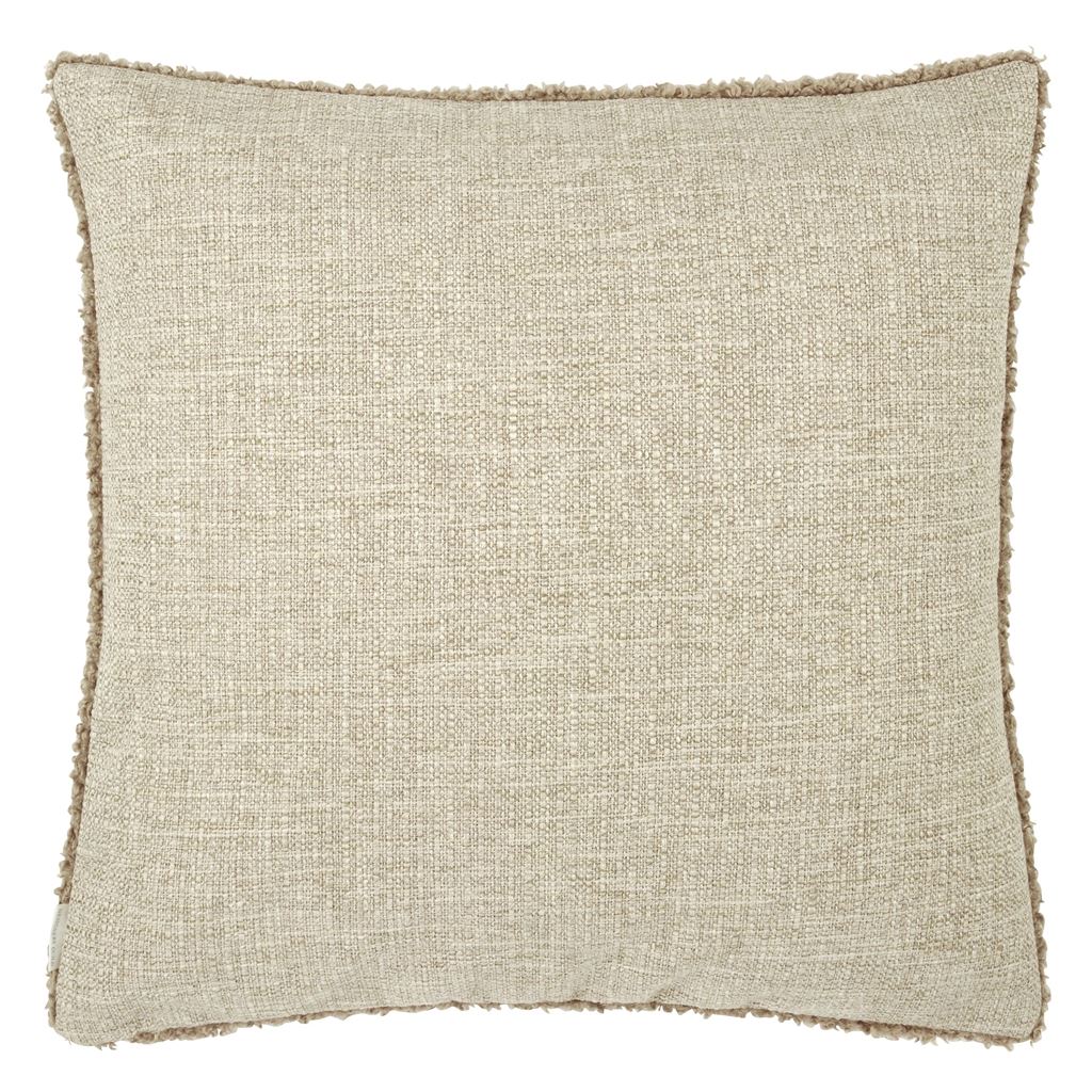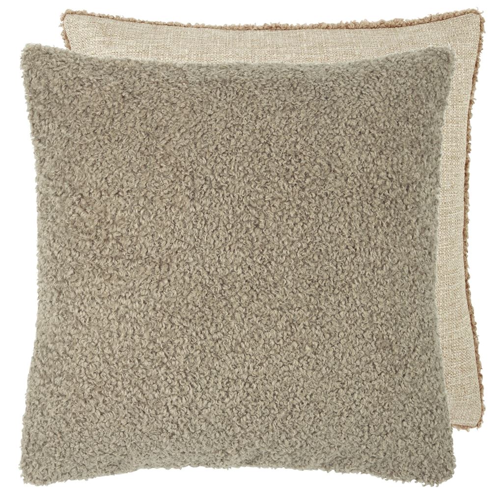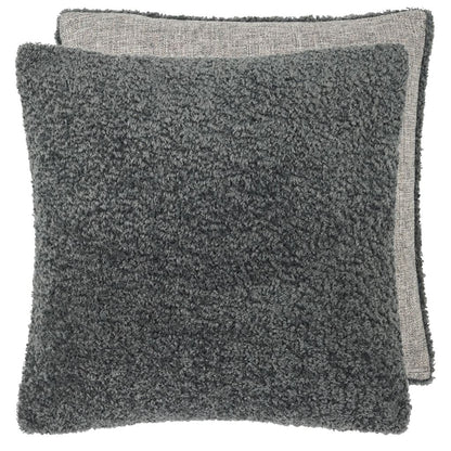 An incredibly soft and fluffy faux sheepskin cushion in graphite is paired with the tweed texture of Skipton in stone. This stylish large square cushion adds depth and texture to your home.