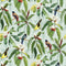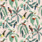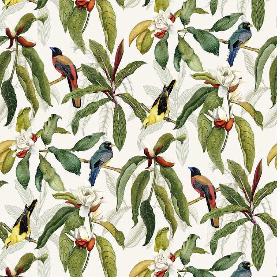 Exotic birds sit in the branches of a magnolia tree with budding flowers. The design is painted in watercolour, with pencil drawn leaves in the background shadowing the foliage. Michelia is a variety of magnolia flower.