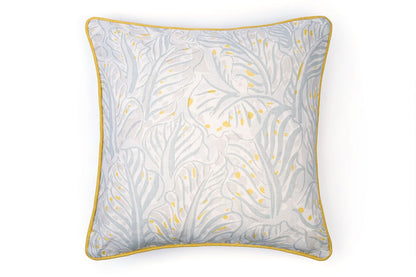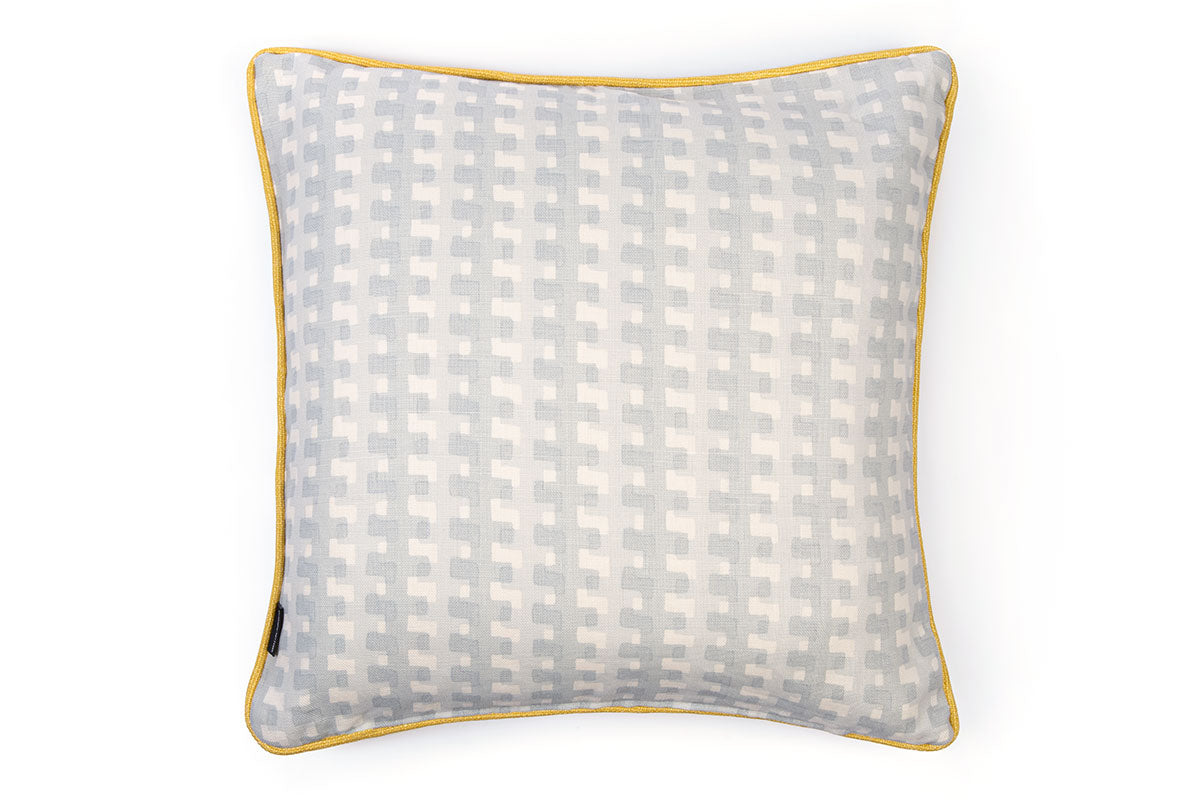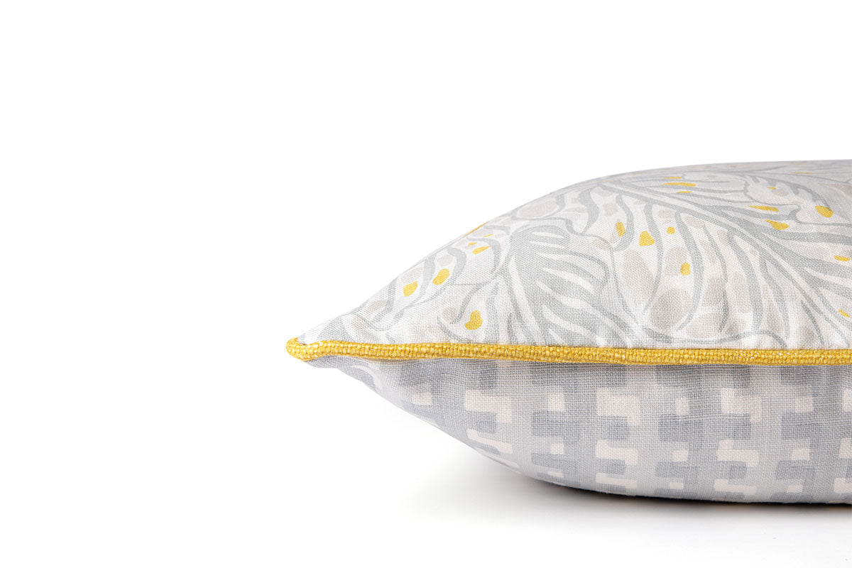 Celebrating the archives of Raoul Dufy with the large-scale botanical print ‘Mille Feuille’ and the geometric pattern of ‘Cremaillere’, finished with a yellow trim. Material: 100% Linen