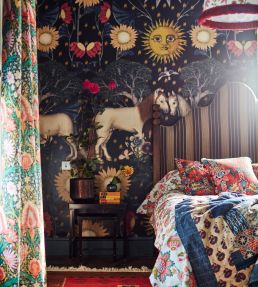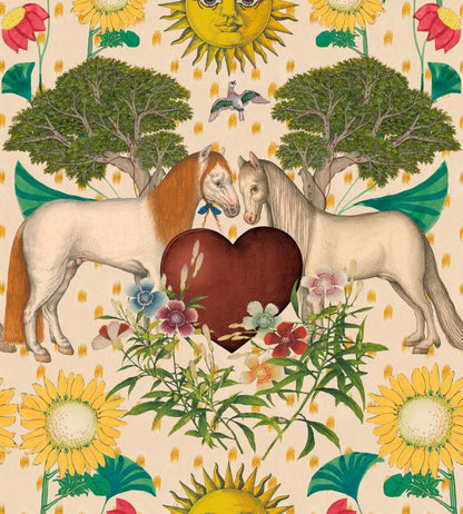 Symbolic hearts radiate a sense of comfort and peace as you lose yourself in the whimsical meadows which surround you with tranquillity. The sun warms your skin as you listen to the sound of birds flying above you. Evoking sounds and smells of long summer afternoons, the Mirage wallpaper, set on two contrasting backdrops, brings a restful ambience into the room.