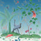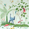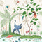 A paradise garden, where a red Ibis walks in a shallow pool watched on by cranes and exotic birds within the trees and foliage. The original design has an ivory background and is also available printed on a grasscloth. Further colourways include backdrops reflecting the time of day; the cool light pre-dawn, soft blush tones at sunrise, and twilight blues.