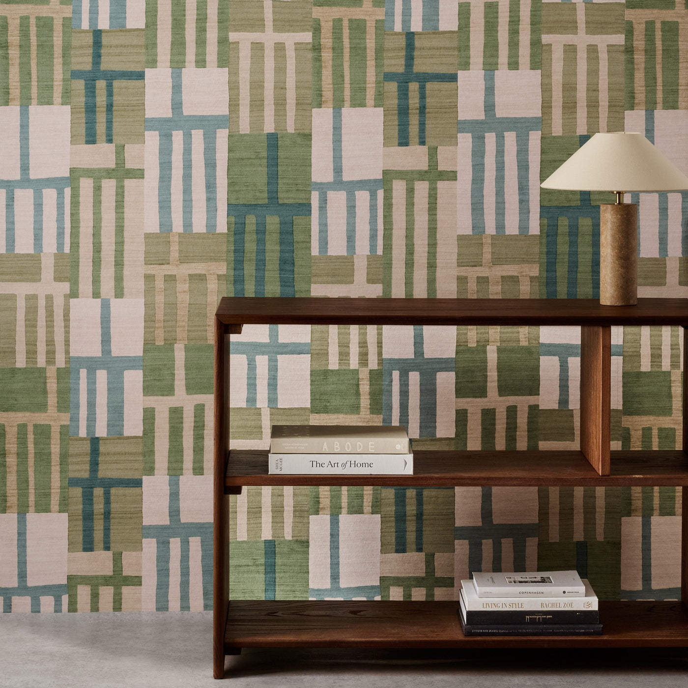 Grids of lines create blocks of colour, drawn with a loose textile feel, in toning colours. Wide width product.