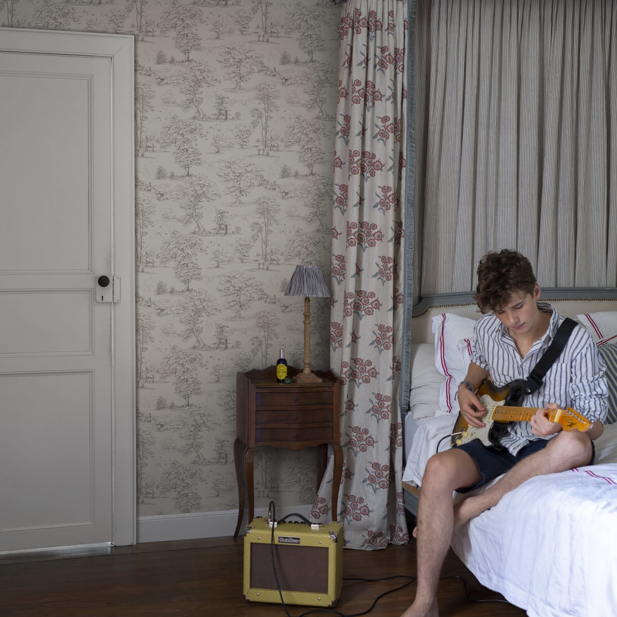 A homage to Sara’s village of Montfort where sheep graze in lush pasture, Izard Antelopes rome the craggy peaks of the distant Pyrenees and Sara’s poodle Adelaide sits under the shade of the ancient oak tree in the field behind the chateau. A bucolic scene that takes you on an imaginary journey around a whimsical Toile de Jouy landscape.