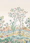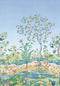 Imaginary trees and plants with fantastical flowers and fruit grow from the banks of a meandering stream. The scene is set against an azure blue background or a beautiful dawn sky, both colourways are also available printed on a grasscloth.