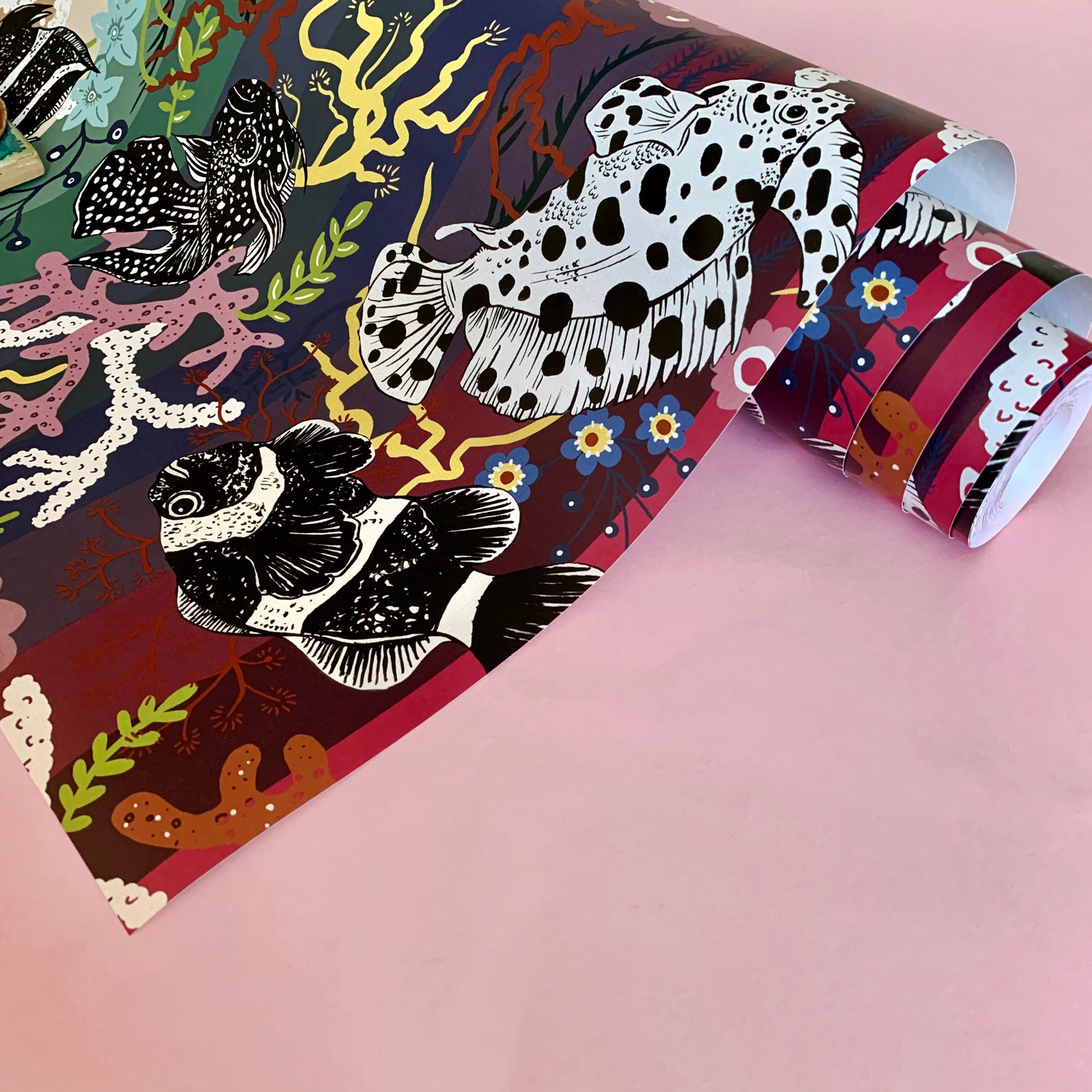 Neptune gets its name from the Roman God of the Sea and is a joyful 'under-the-sea' print featuring one of the wonders of the world, the great barrier reef. Neptune depicts colourful corals, seaweeds and beautiful black and white reef fish.