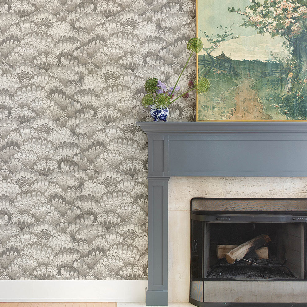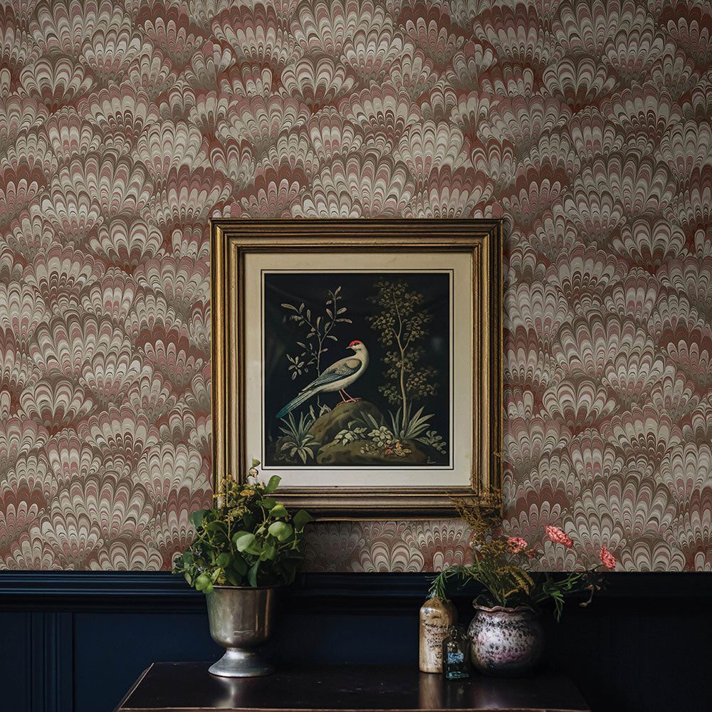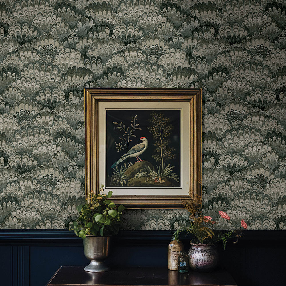 This wallpaper features a mesmerising marbled pattern with fan-like shapes that flow organically across the surface. The design evokes the traditional art of paper marbling, offering a sense of movement and visual depth.