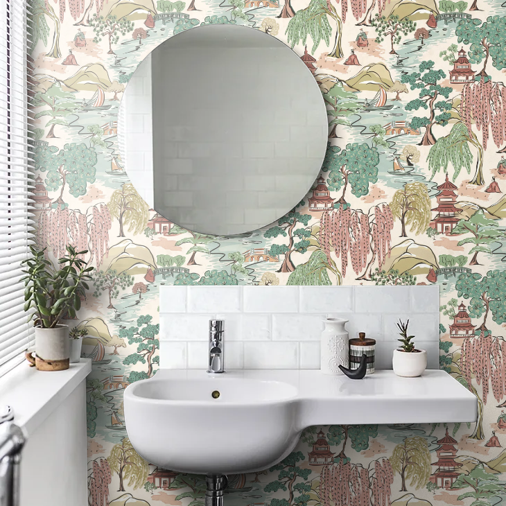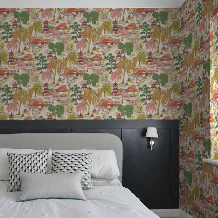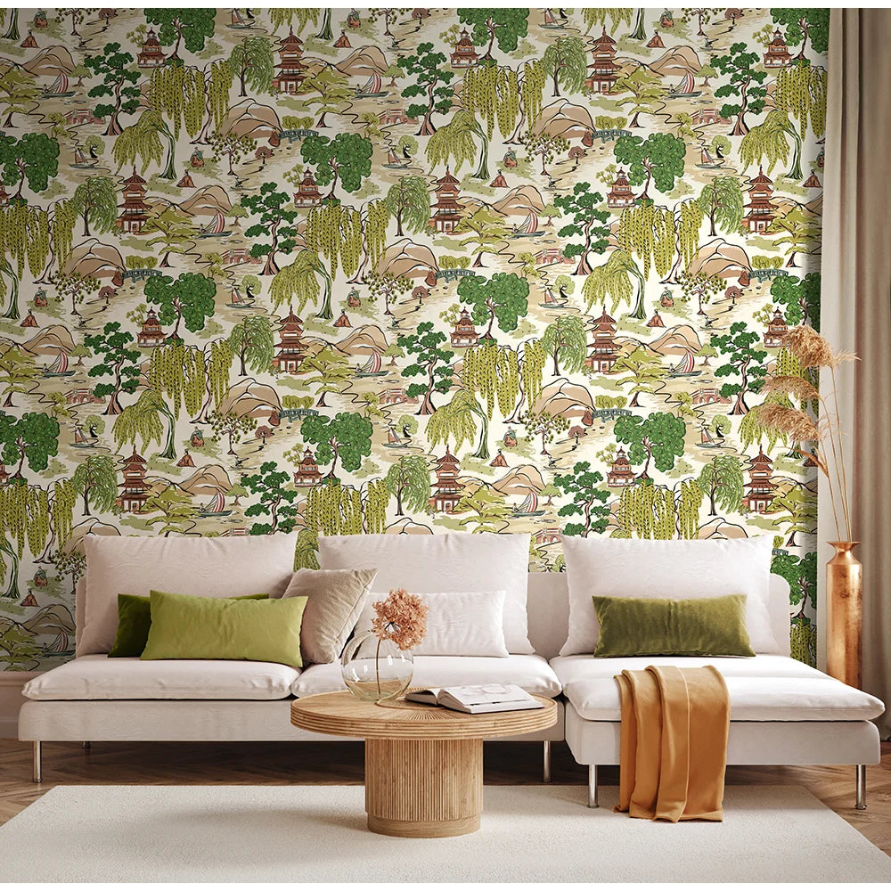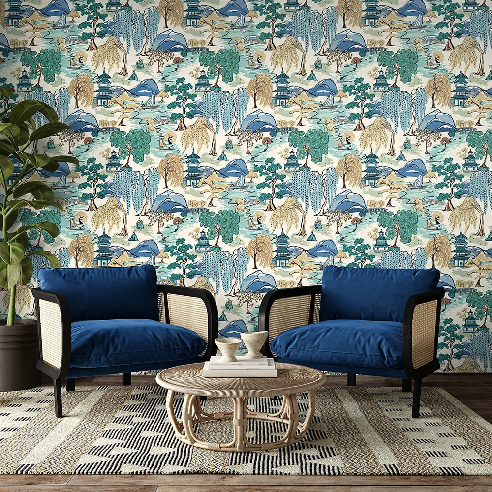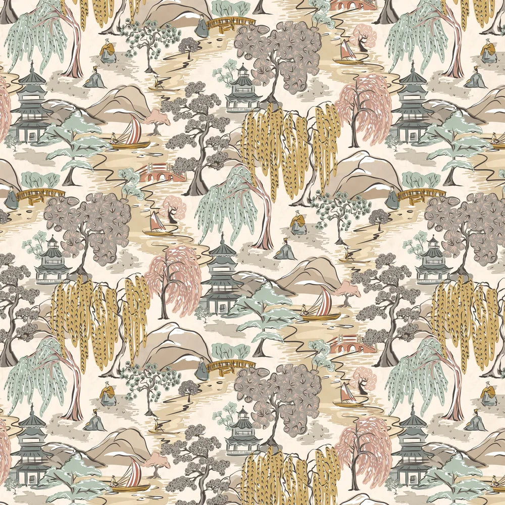 Inspired by traditional Japanese landscapes, Oka captures a richly detailed and illustrative scene, where rolling hills are dotted with willow trees, boats and traditional figures. Pagodas sit at the heart of the design, nodding to the beauty of Japanese architecture, symbolising sacred space and quiet contemplation, ideal for interiors that seek character and calm. Designed with an overprint effect which mimics traditional hand printing, this effect adds depth and a sense of movement.