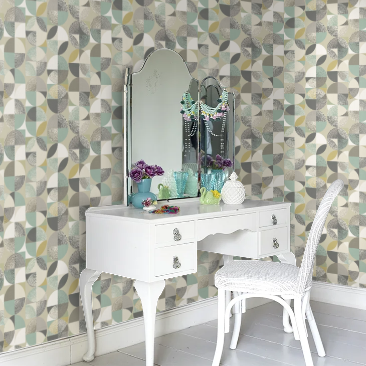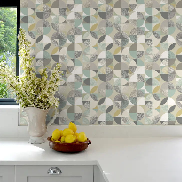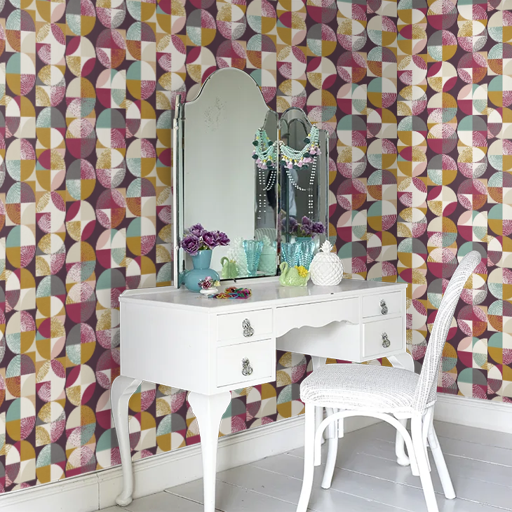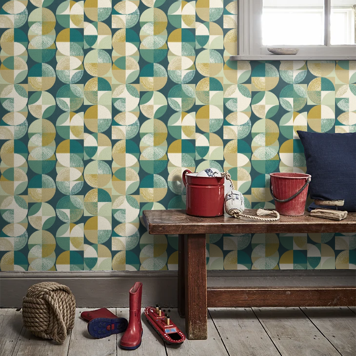 Quirky and kinetic, Orb’s small-scale design of overlapping circles is almost like looking through a kaleidoscope. Divided in to quarters and irregular shapes, the motif seems to dance and move across the wall. With a linen texture that runs throughout, this wallpaper is an excellent colour carrier.
