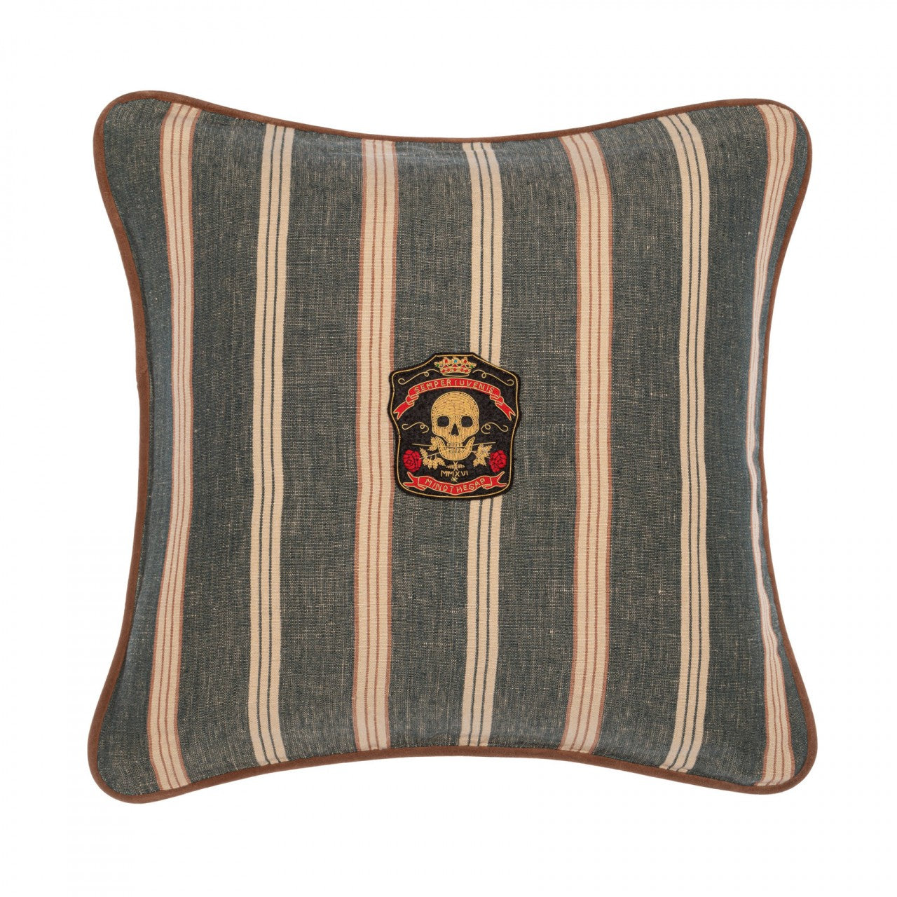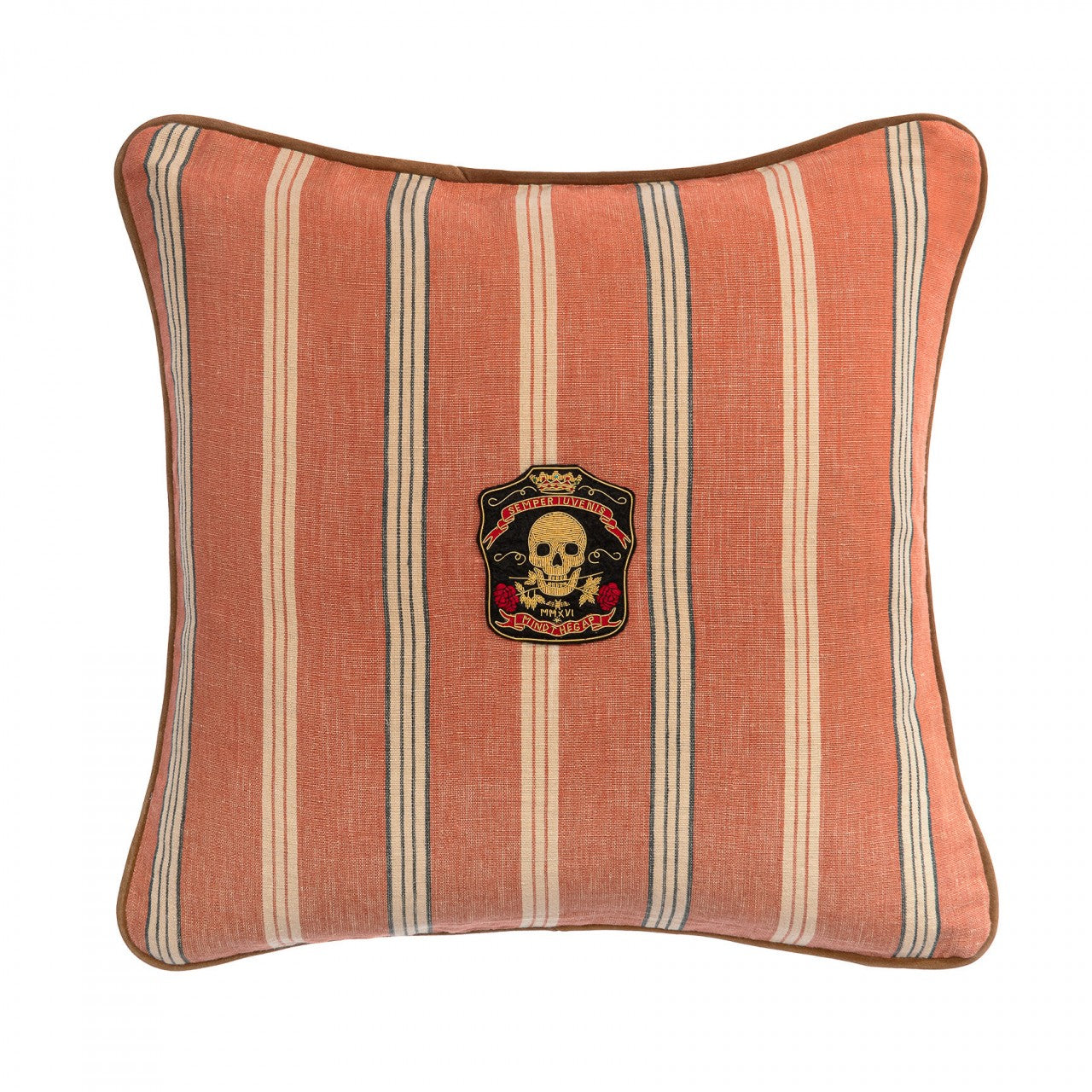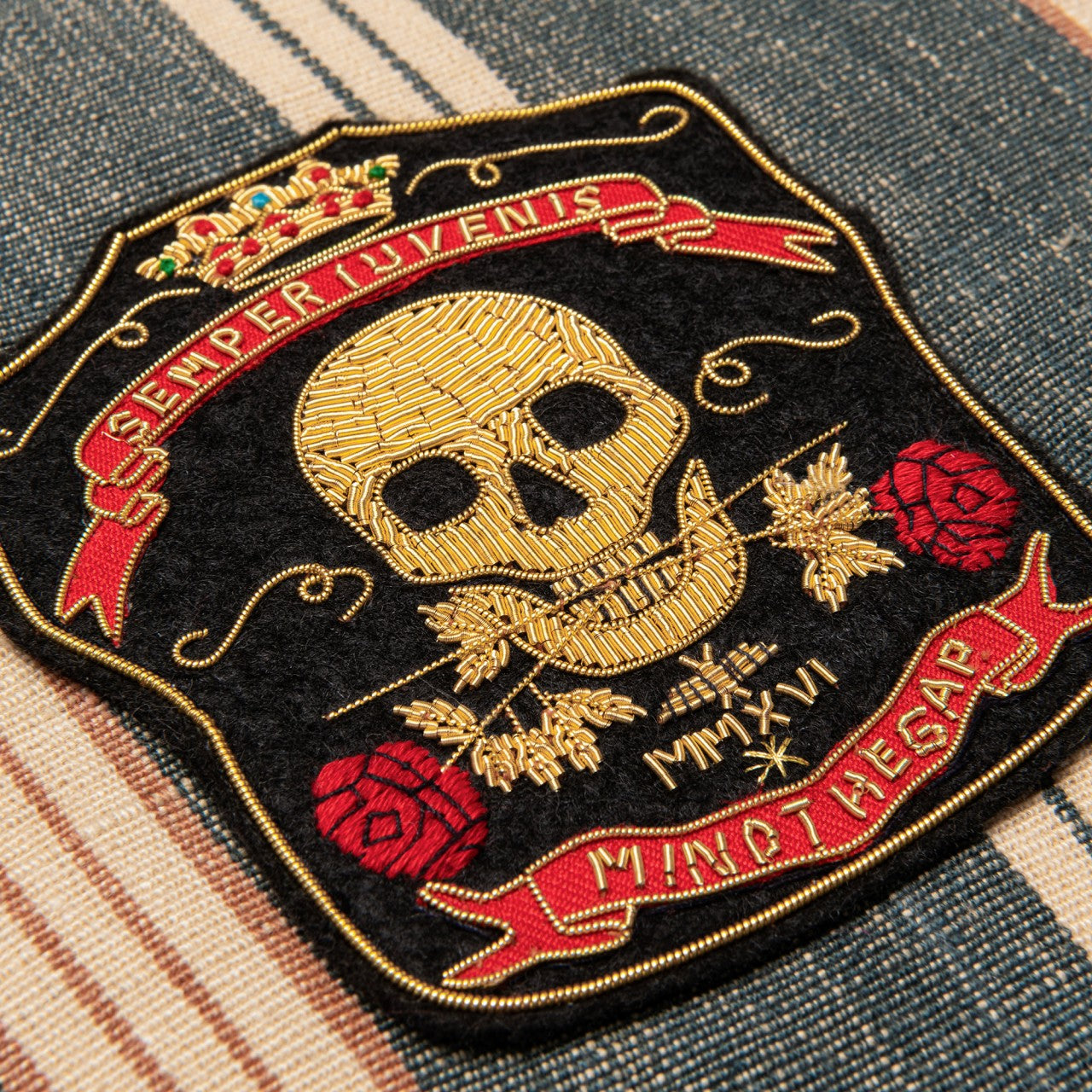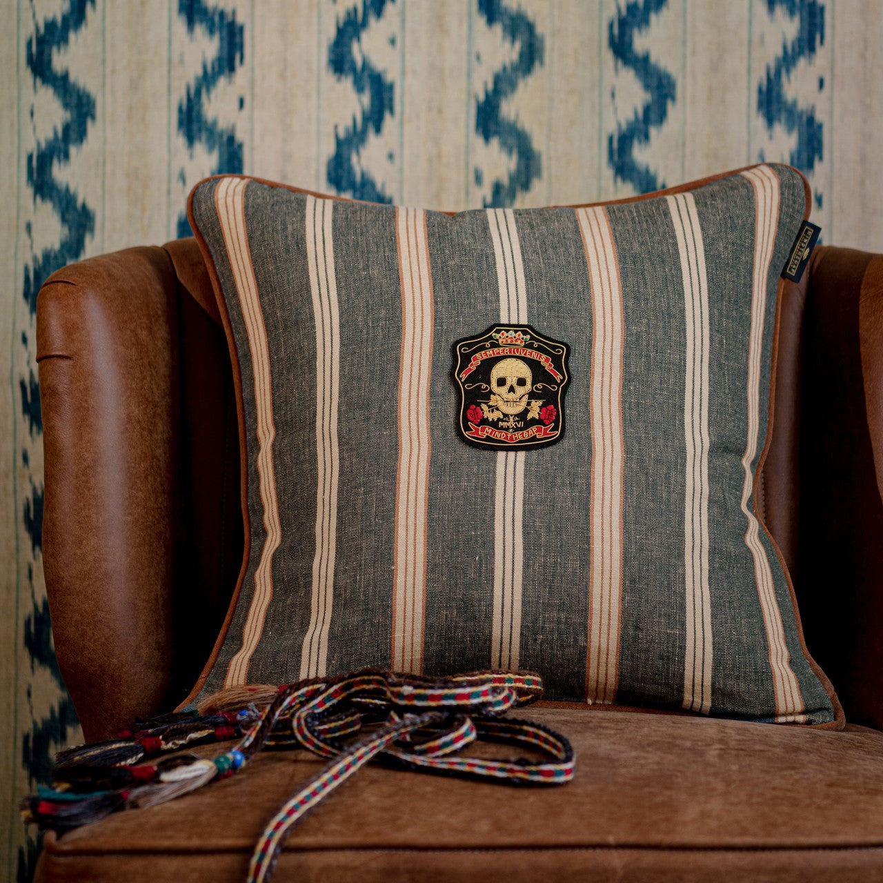 Referencing Vortex I, the rock festival held in Oregon in 1970, the OREGON STRIPES woven linen cushions show a colour palette which embodies the stonewashed denim fashion of the era. The Denim Washed and Orange Washed striped linen cushions are complemented with a brown leather piping, that enhance the premium look of the product. The front cover is decorated with a beautiful hand-embroidered metallic bullion displaying a skull and two roses representing the main symbol of the Woodstock Collection, Semper Iuvenis. Filling: Duck feather, Composition: 100% natural linen, stonewashed woven fabric