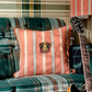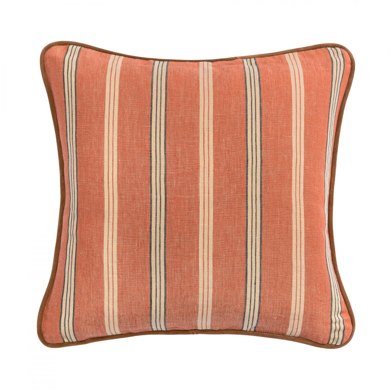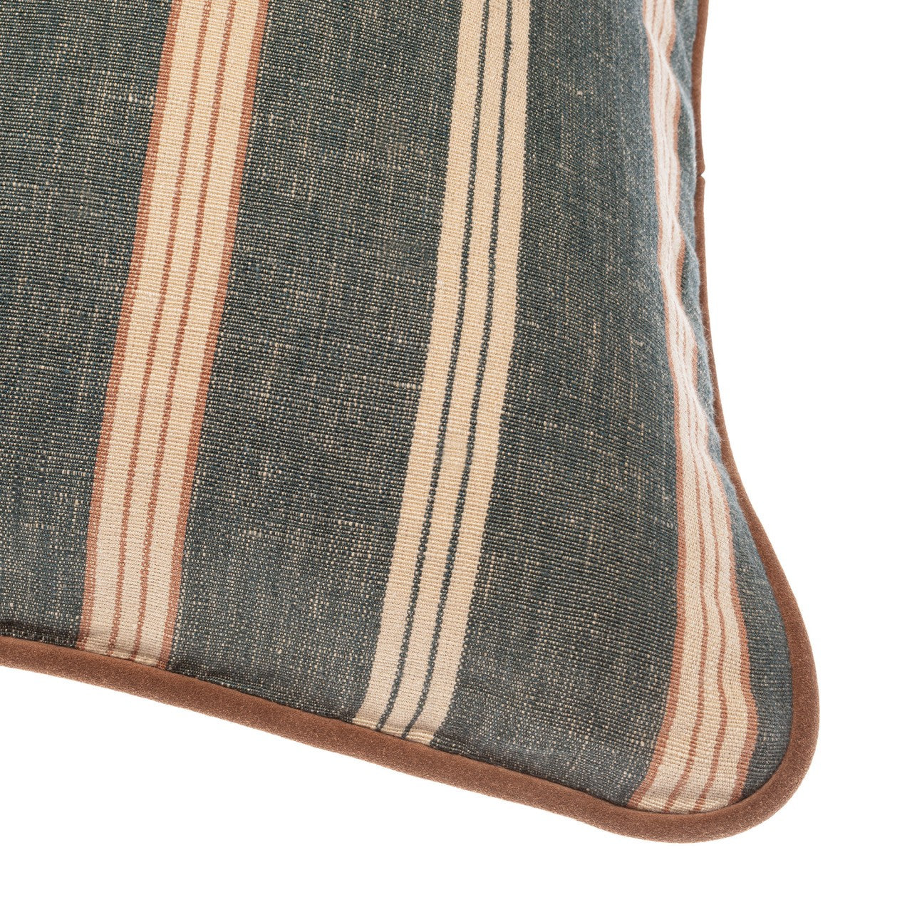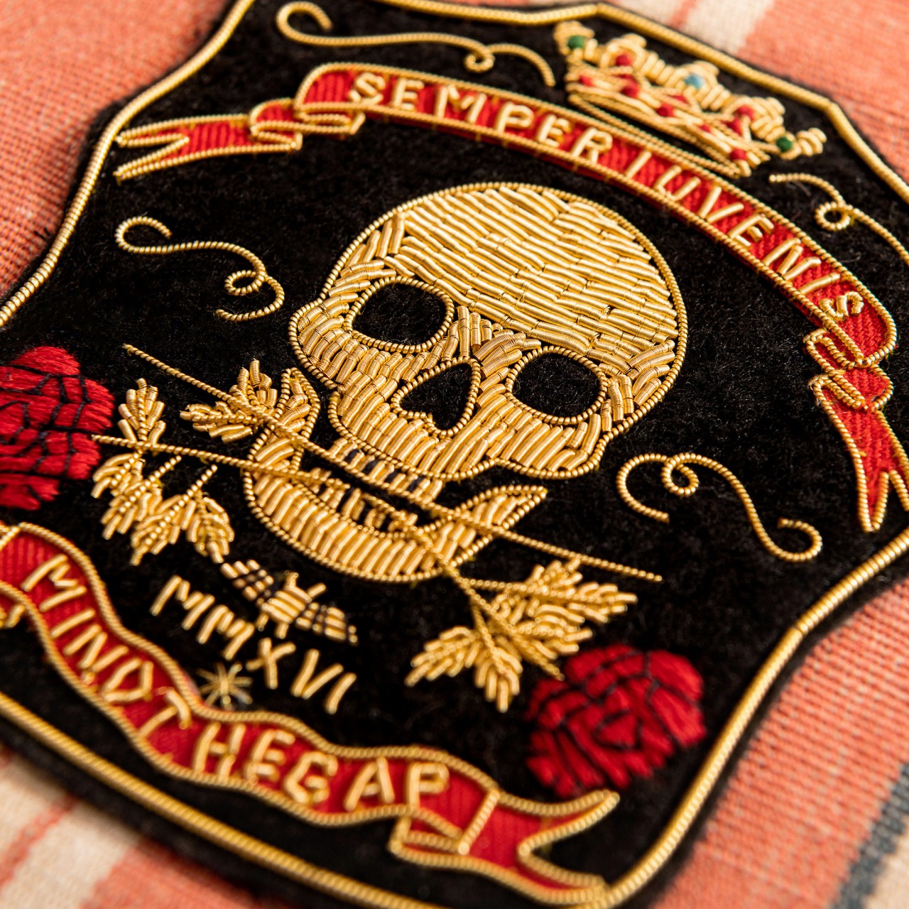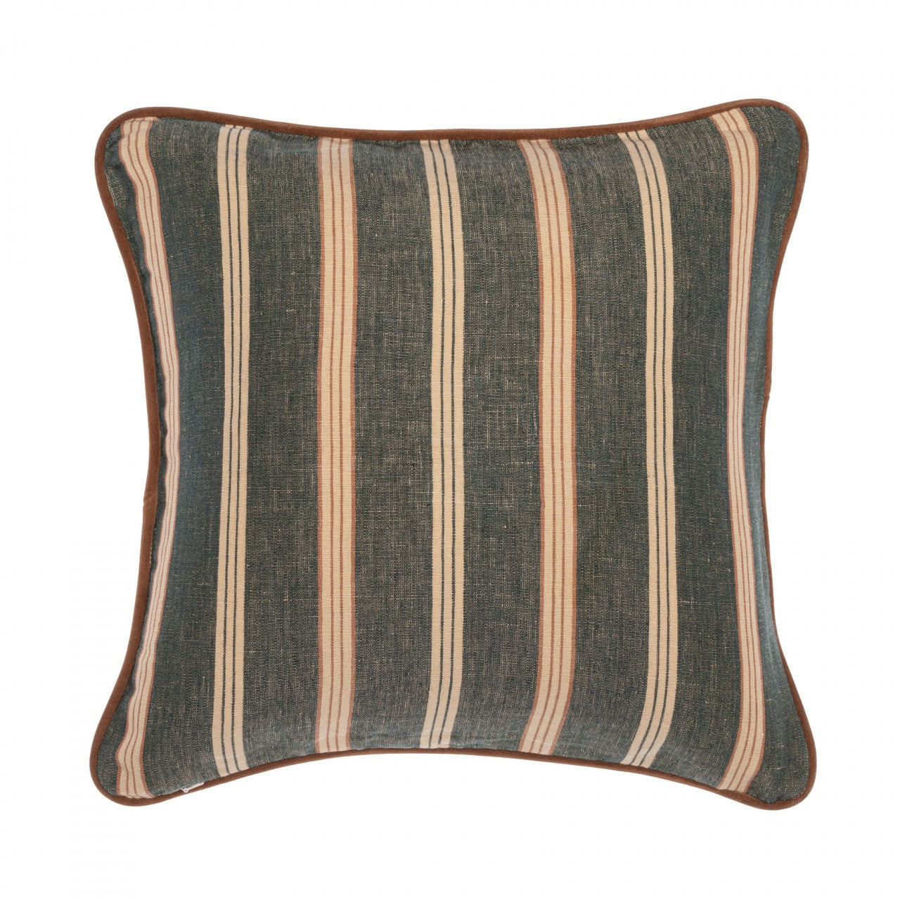 Referencing Vortex I, the rock festival held in Oregon in 1970, the OREGON STRIPES woven linen cushions show a colour palette which embodies the stonewashed denim fashion of the era. The Denim Washed and Orange Washed striped linen cushions are complemented with a brown leather piping, that enhance the premium look of the product. The front cover is decorated with a beautiful hand-embroidered metallic bullion displaying a skull and two roses representing the main symbol of the Woodstock Collection, Semper Iuvenis. Filling: Duck feather, Composition: 100% natural linen, stonewashed woven fabric