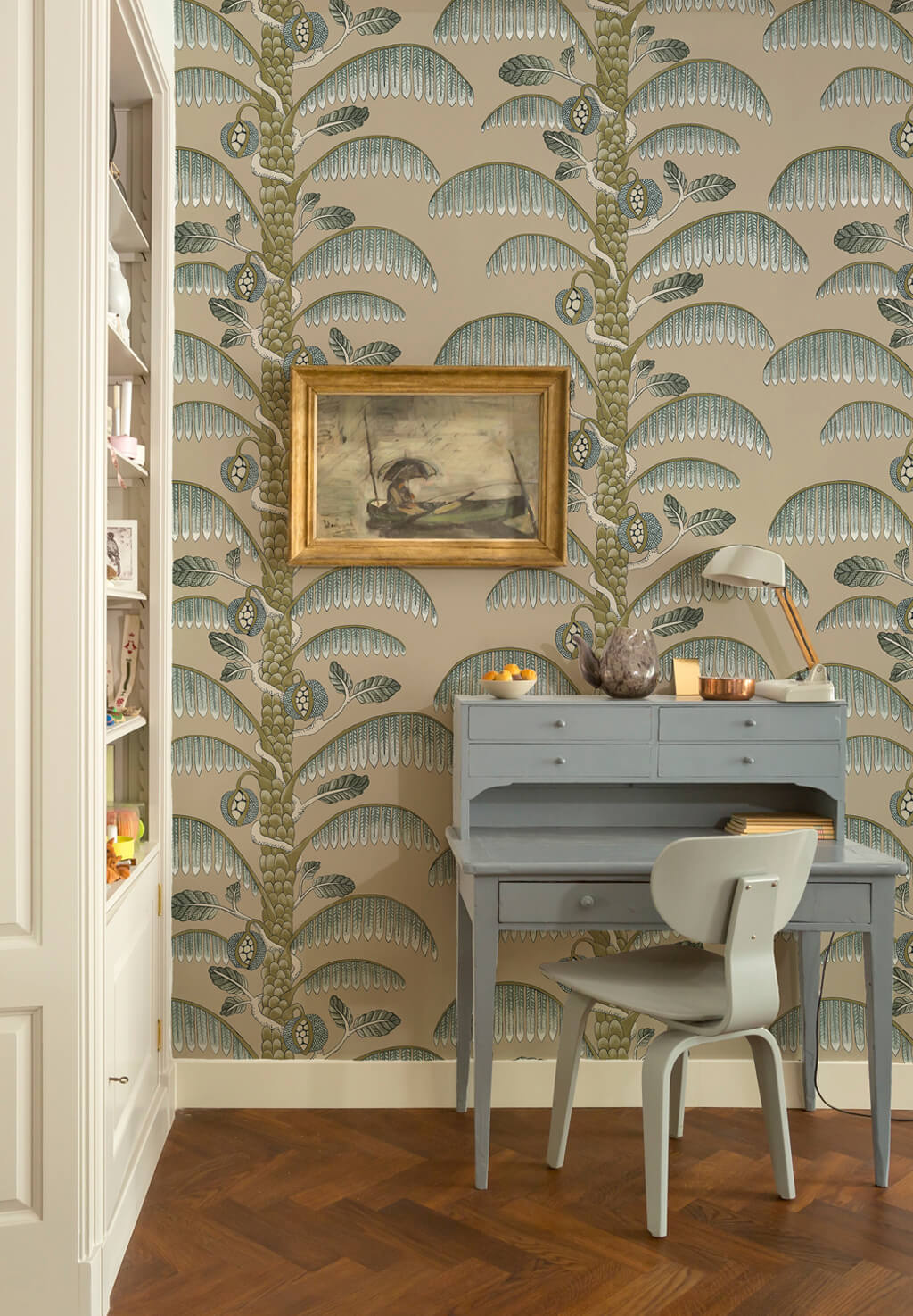 This striped design is a stylised take on the tropical shapes and motifs of the palm tree. A simple yet striking design. Josephine painted this design using the matt emulsion paint range. See below for the recommended paint colours for this design.