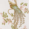 A fantastical bird with opulent plumage perches on branches laden with colourful blossom.