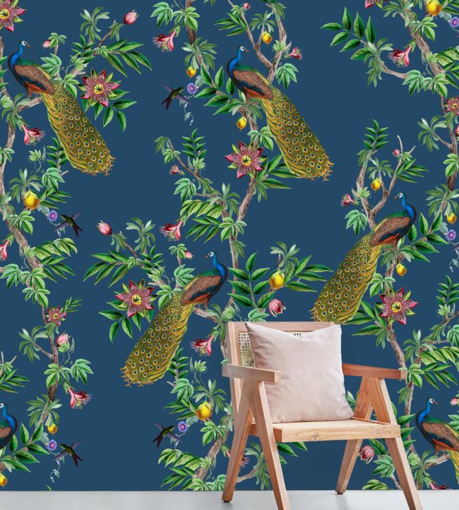 Majestic peacocks boasting colourful markings of blue, gold and red, feature on this stylish and elegant design in a deep blue tone. Divided into 4 x 48.7cm drops.