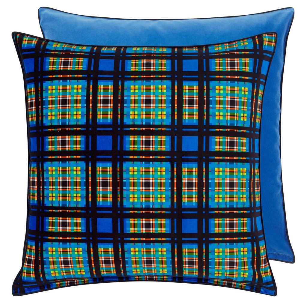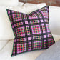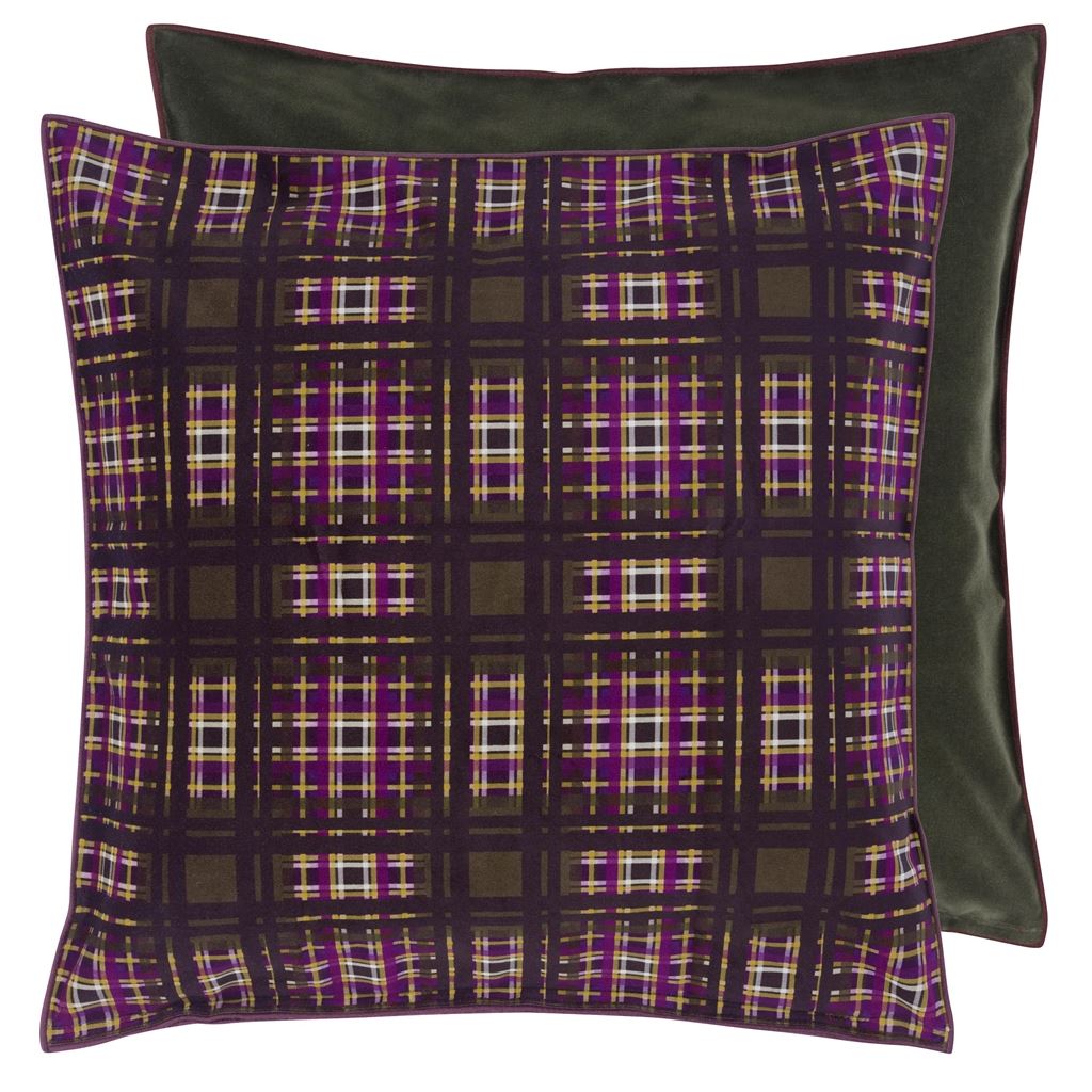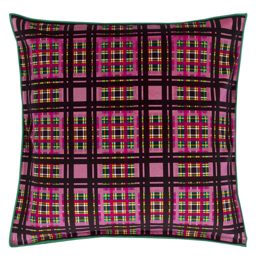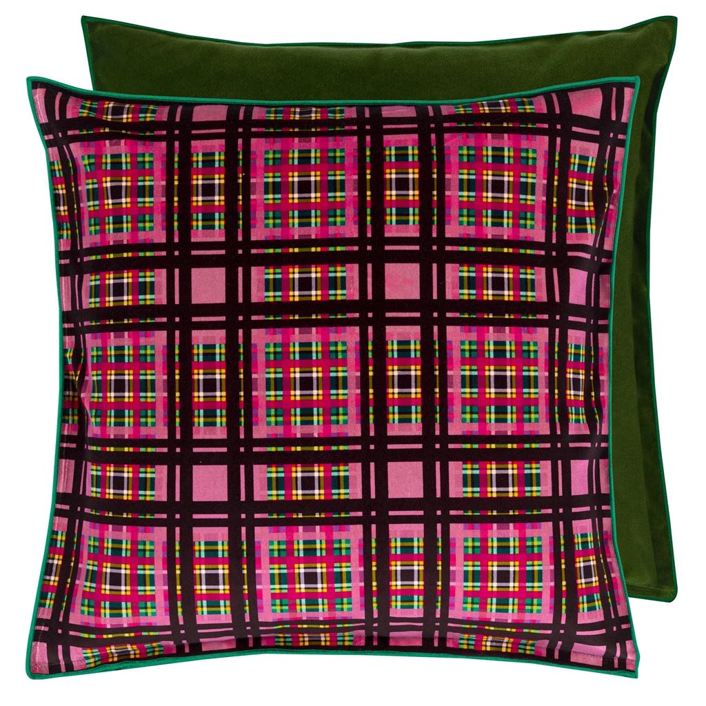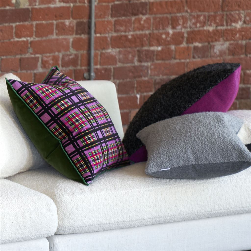 A contemporary tartan check velvet cushion in vivid fuchsia with a bold overcheck in black and highlights of emerald pimento and white. This large square luxurious cushion is digitally printed onto luxurious cotton/viscose velvet and paired with our best selling cotton velvet Varese fir on the reverse and finished with stylish overlocked edges.