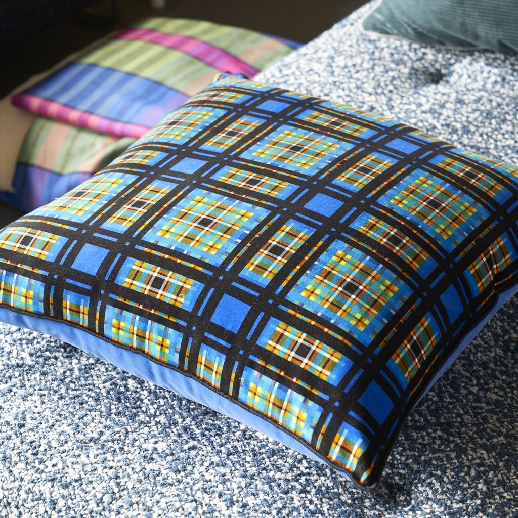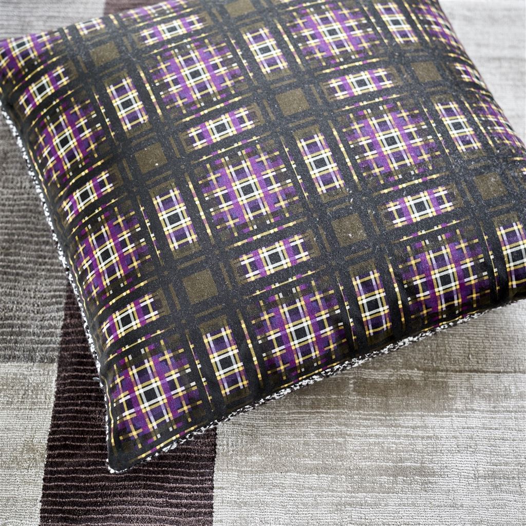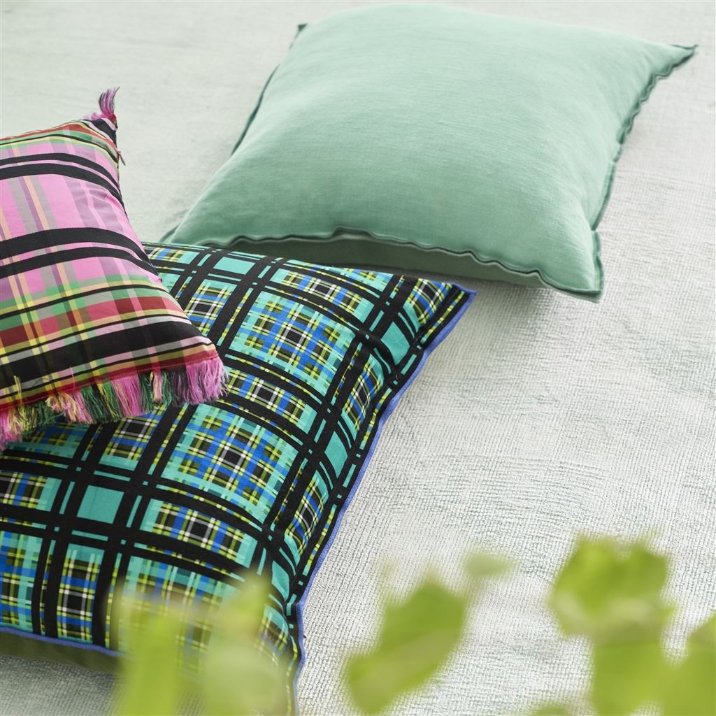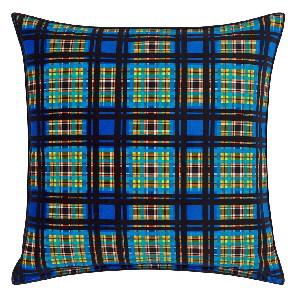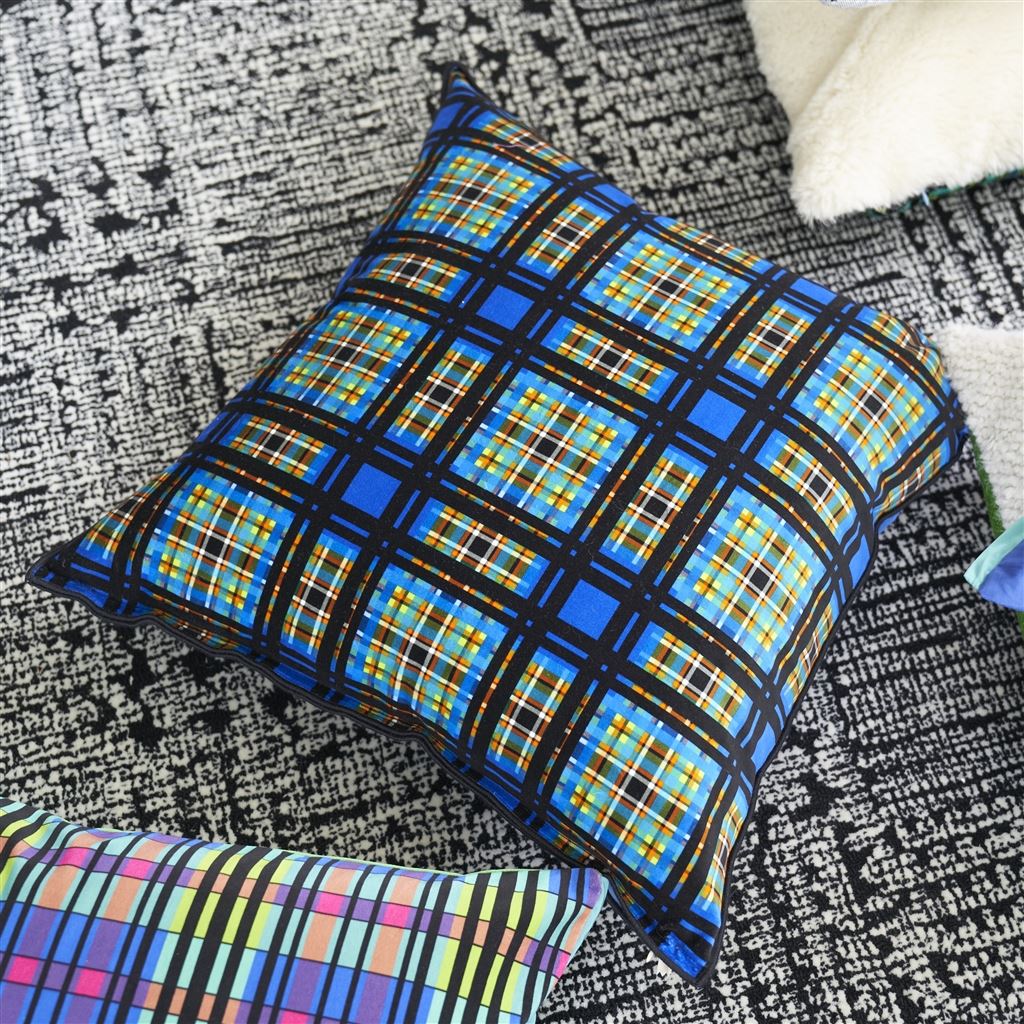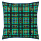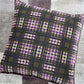 A contemporary tartan check velvet cushion in vivid fuchsia with a bold overcheck in black and highlights of emerald pimento and white. This large square luxurious cushion is digitally printed onto luxurious cotton/viscose velvet and paired with our best selling cotton velvet Varese fir on the reverse and finished with stylish overlocked edges.