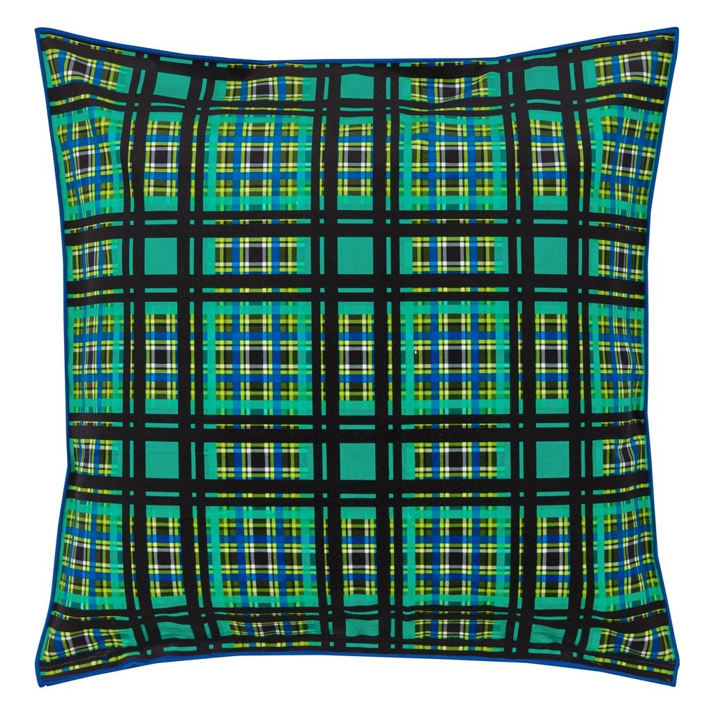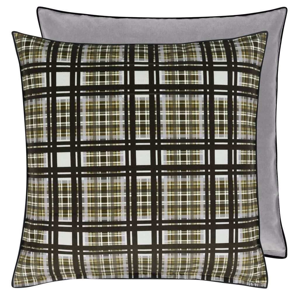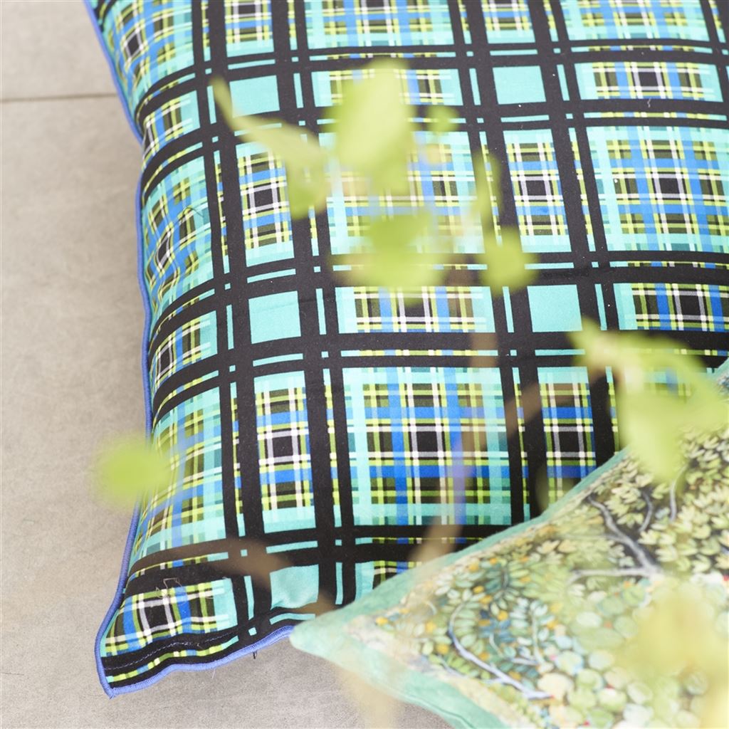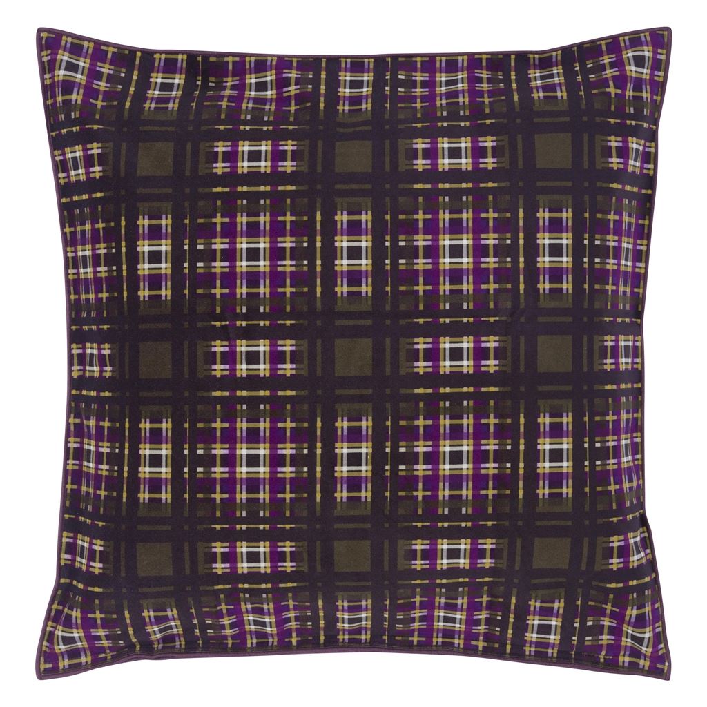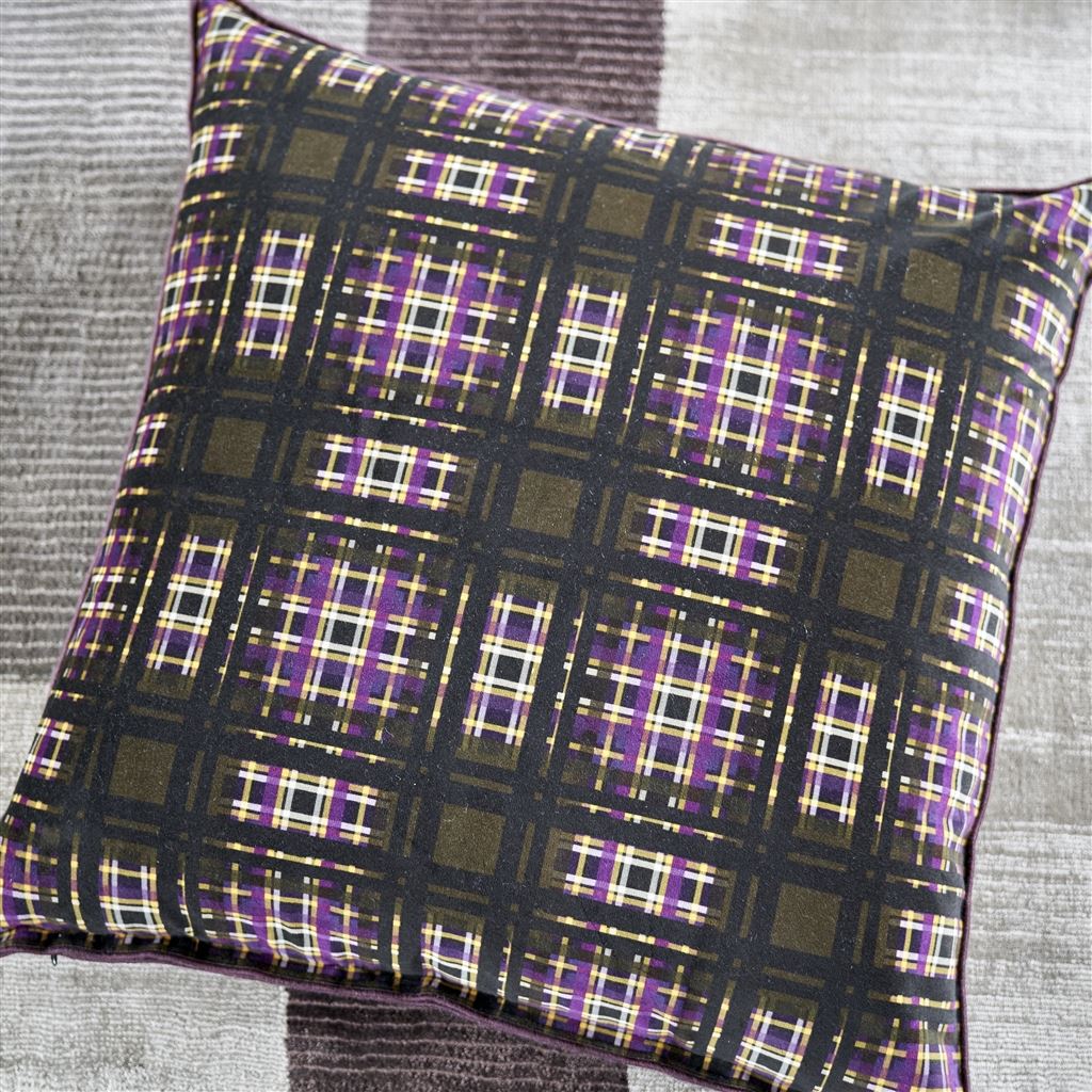 A contemporary tartan check velvet cushion in vivid fuchsia with a bold overcheck in black and highlights of emerald pimento and white. This large square luxurious cushion is digitally printed onto luxurious cotton/viscose velvet and paired with our best selling cotton velvet Varese fir on the reverse and finished with stylish overlocked edges.