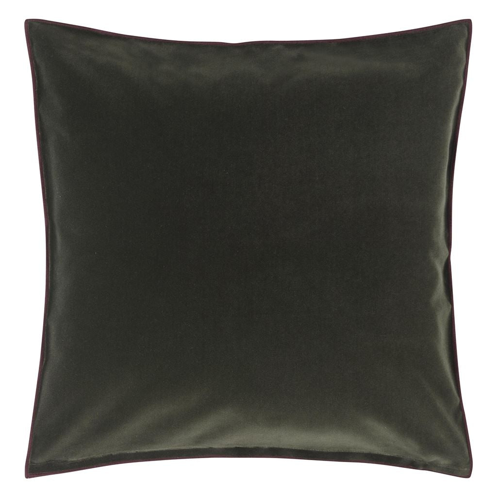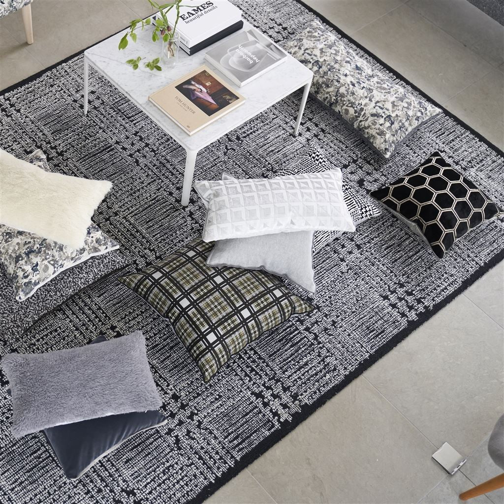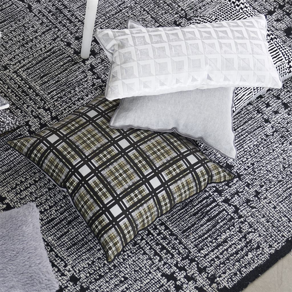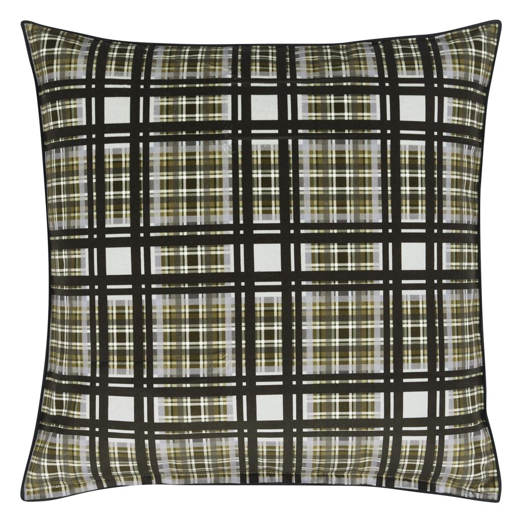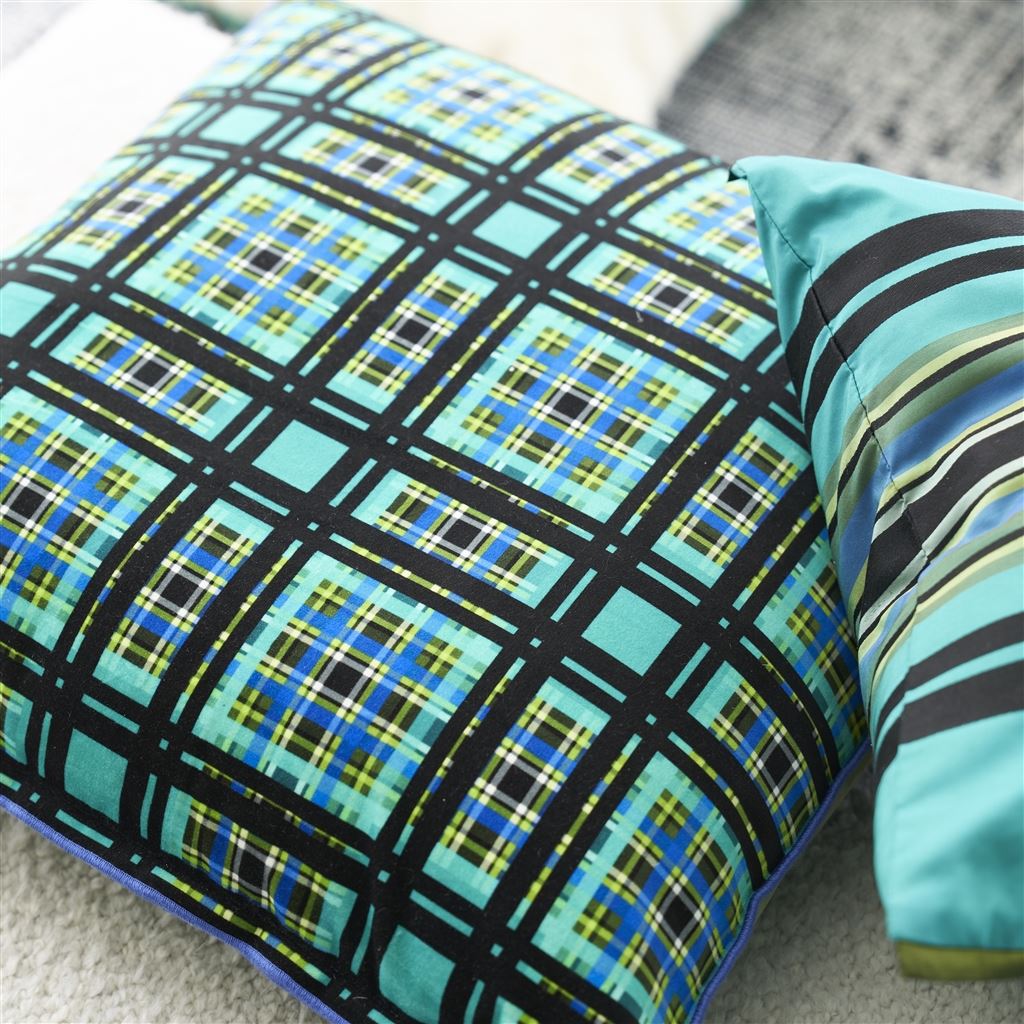 A contemporary tartan check velvet cushion in vivid fuchsia with a bold overcheck in black and highlights of emerald pimento and white. This large square luxurious cushion is digitally printed onto luxurious cotton/viscose velvet and paired with our best selling cotton velvet Varese fir on the reverse and finished with stylish overlocked edges.