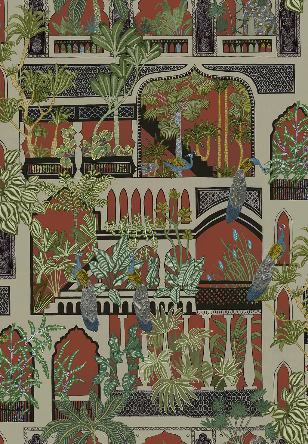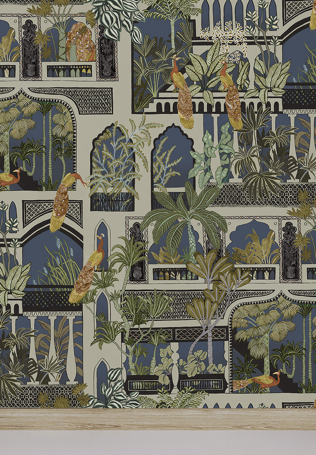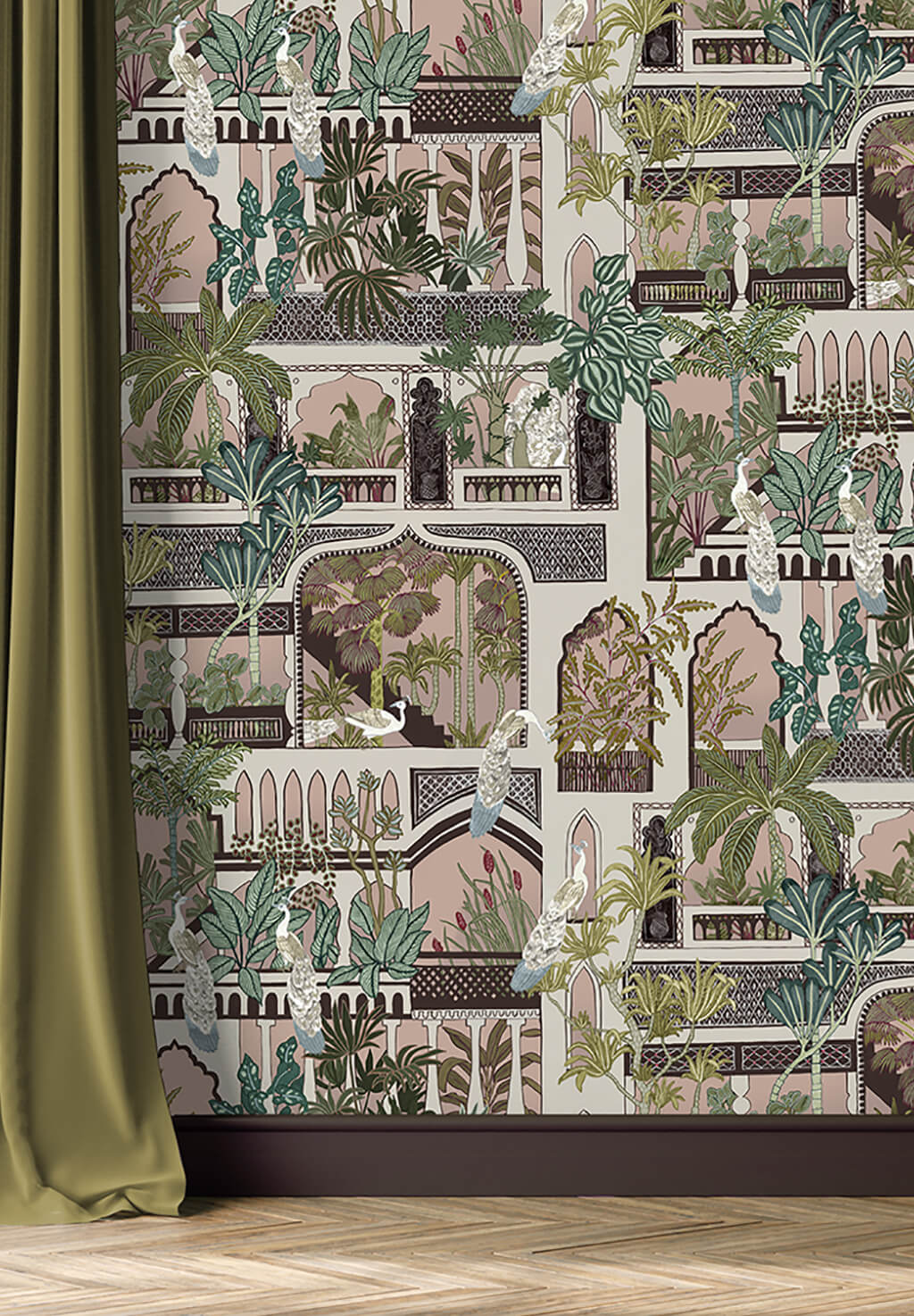 This wallpaper design was inspired by Indian architecture. It is bought to life with lush foliage and playful peacocks. This pattern has traditional geometric pattern set in architectural Doorways and Windows. All meticulously hand painted.