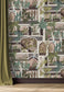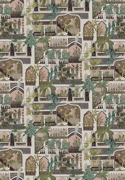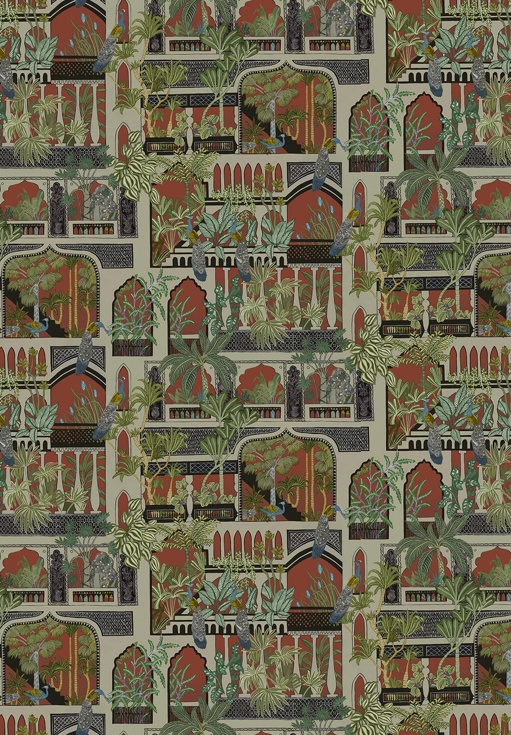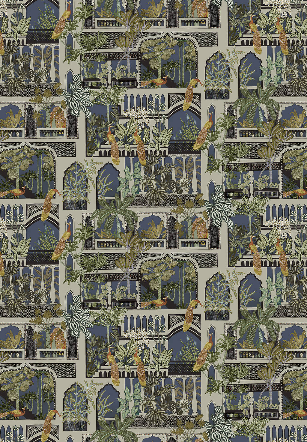 This wallpaper design was inspired by Indian architecture. It is bought to life with lush foliage and playful peacocks. This pattern has traditional geometric pattern set in architectural Doorways and Windows. All meticulously hand painted.