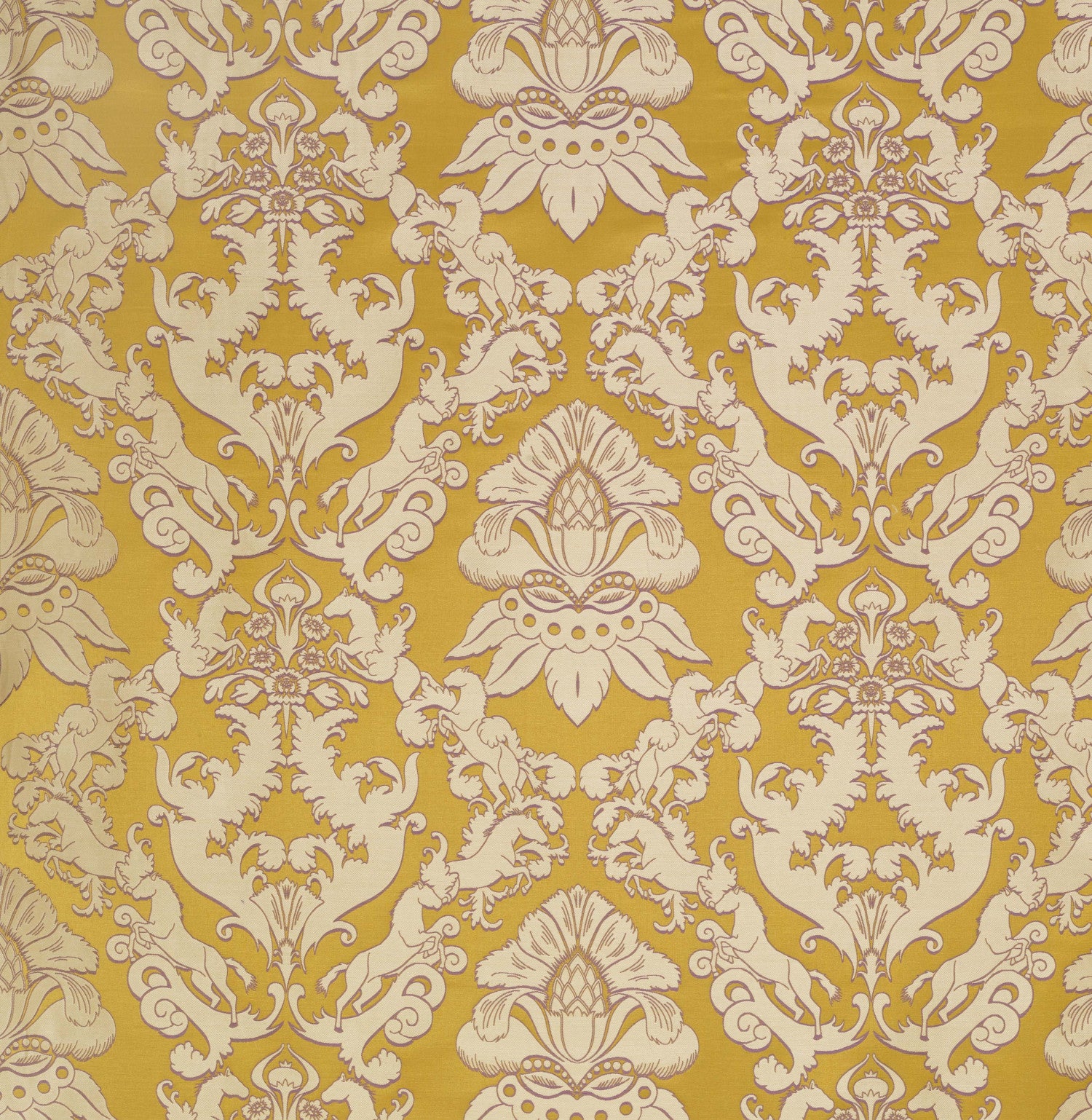 The majestic winged horse is depicted in a scrolling silk mix and linen damask edged with a contrasting flash of colour.