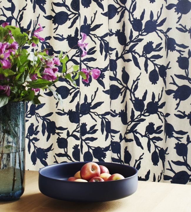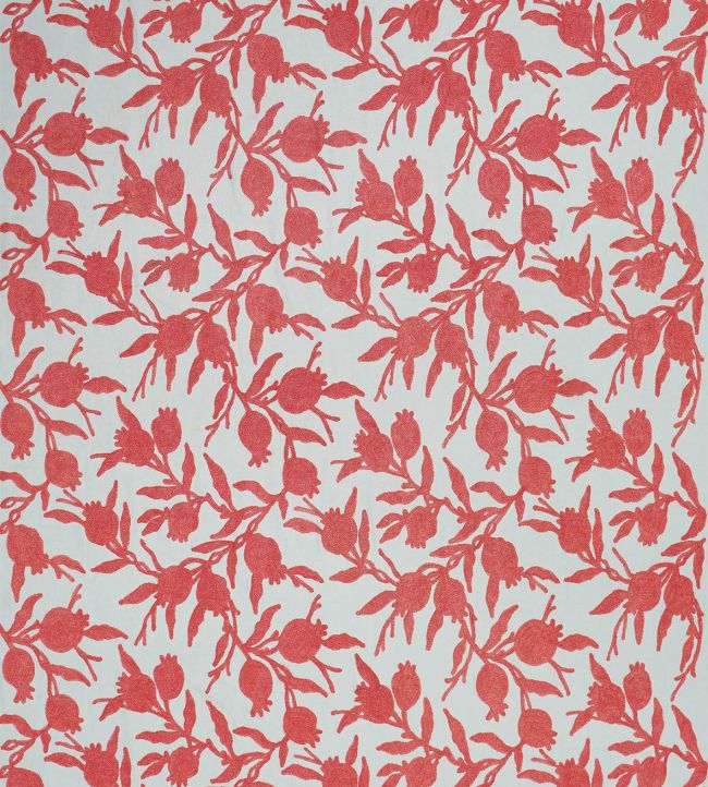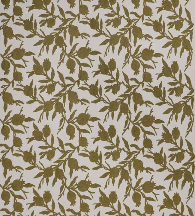 A crewelwork design on a cotton and linen ground that forms silhouettes of persimmon fruit on a vine. The graphic silhouette effect brings both the technique and the artwork up to date.