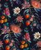 This stunning Physic Garden wallpaper in 'navy' features a classic white and blush floral pattern, with pops of vibrant oranges and delicate flowers scattered throughout. The contrast between the boldness of the citrus fruits and the moody, deep background creates a striking visual impact.