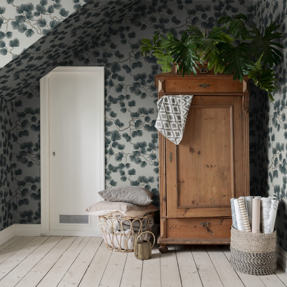 Our beloved wallpaper Pine in Nordic surroundings. The tree stands tall over centuries and stays green all year round with its lacy feathers, despite bitter coldness and snow. The branches cover the wall in a light, large-patterned dance. Vivid yet serene.