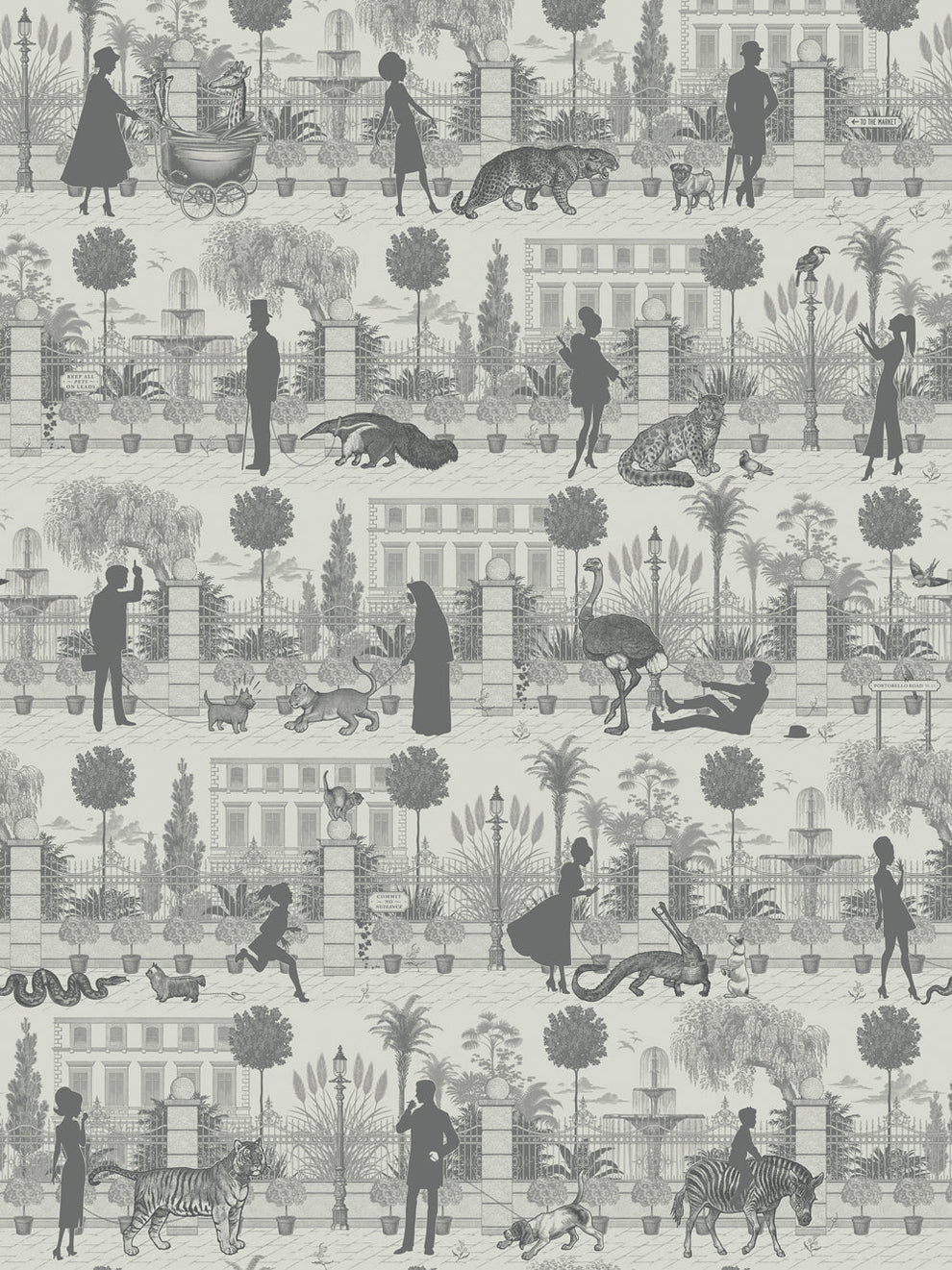 Inspired by London’s most unusual pets, this detail-rich wallpaper revisits a bonkers, bygone era where you could encounter an array of exotic animals not just at the zoo, but on the streets! Beautifully illustrated, you’ll discover something new each time you look. Lions, leopards and lemurs stroll casually through Regency inspired streets and parklands as they cross paths with other bewildered pets for a playful, pictorial print.