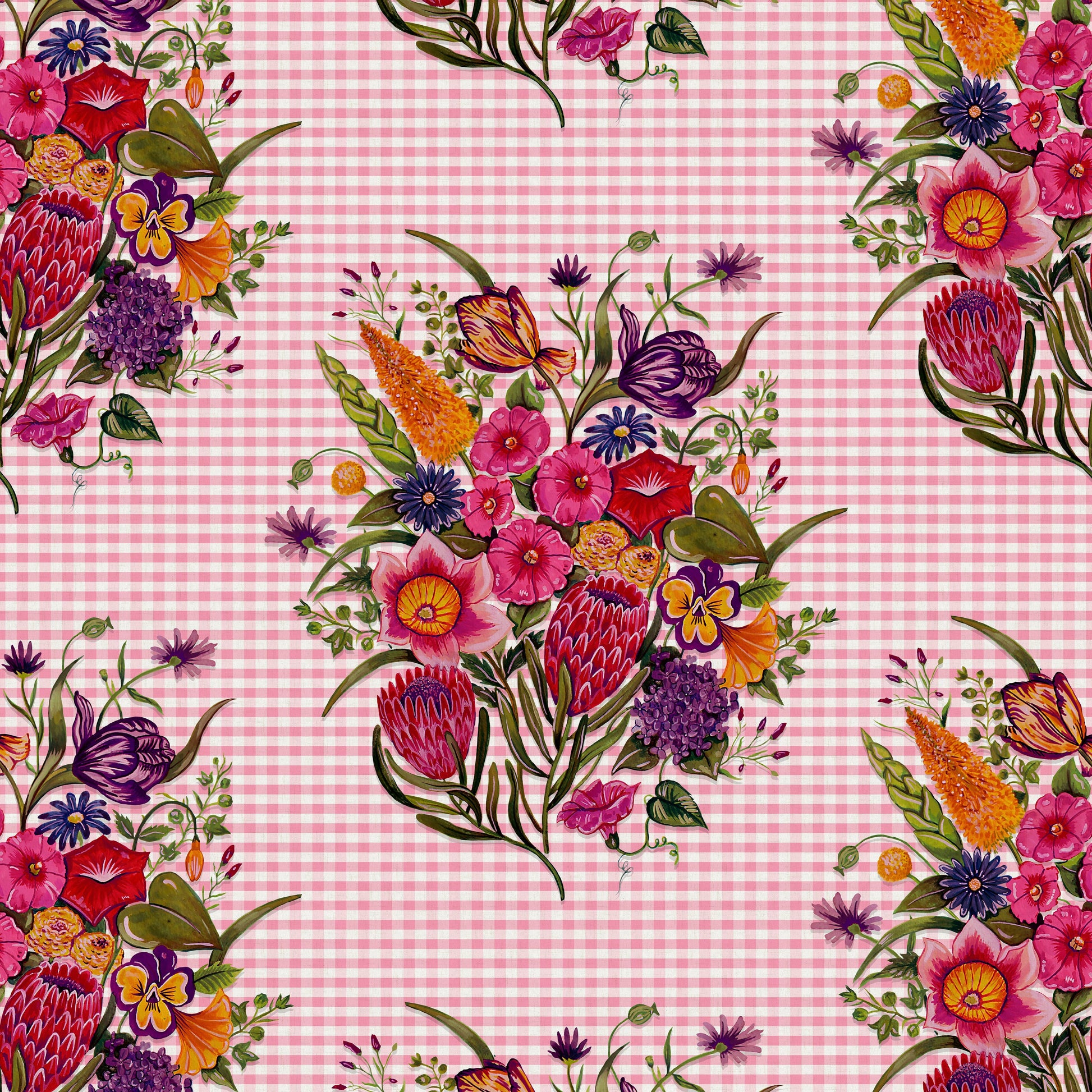 Say hello to our gorgeous new print, Posy. A vibrant bouquet of stunning florals on a beautiful traditional gingham background. Posy features proteas, pansies, gladiolus, tulips and morning glory. We love the traditional bouquet style prints so we have reimagined our own version that is wonderfully colourful and suitably cottagecore!