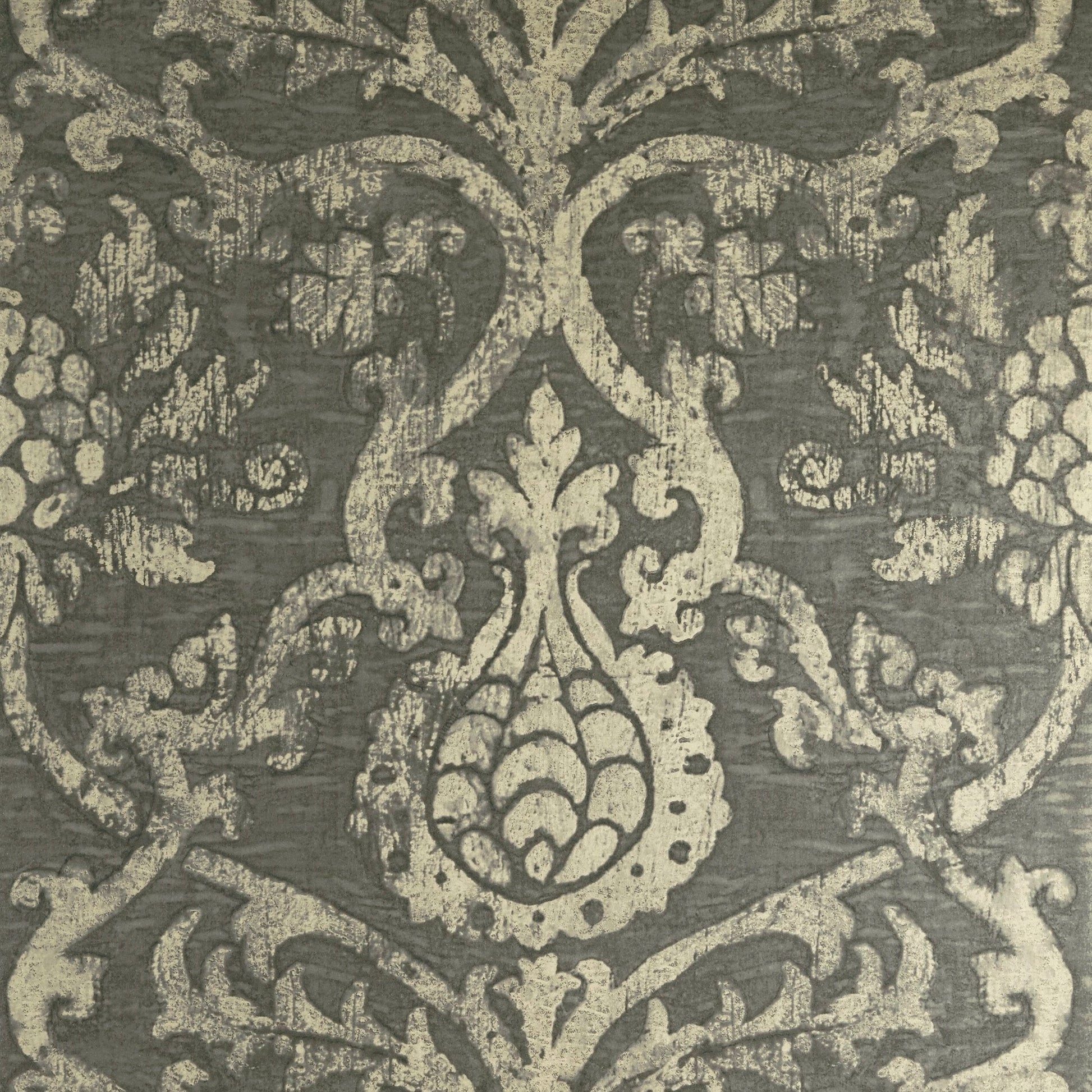 Pravata Damask also comes from artwork produced by an Italian artist. It maintains a textural, weathered fresco look through layers of gravure printing. The mirrored effect of foil comes through printed ink.